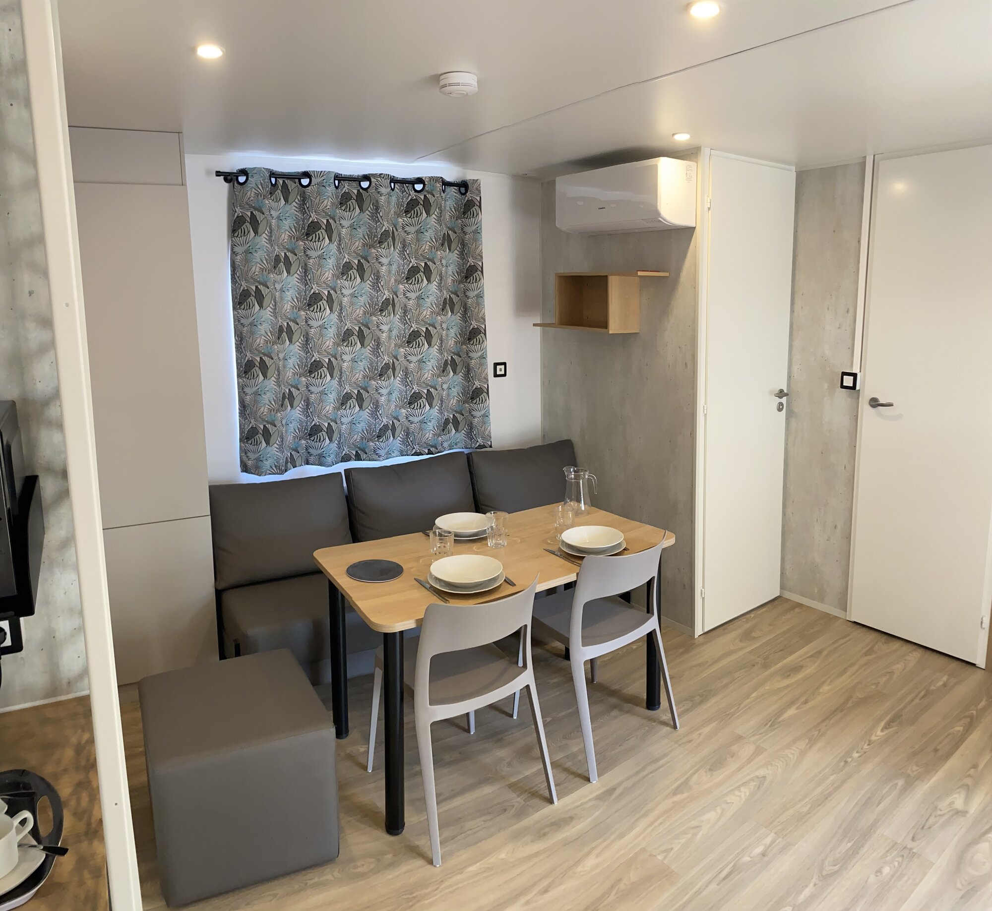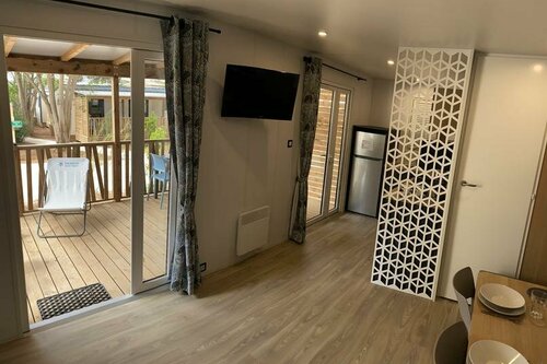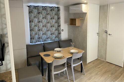 Mobile home (3/6 people) 30m² with 15 m² covered terrace, 1 bedroom with 160x200 bed and 1 bedroom with single beds, USB port in each bedroom. Separate shower room and WC, kitchenette with fridge/freezer, microwave, Senséo coffee maker, gas hob, crockery and cleaning kit...