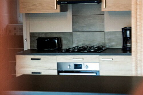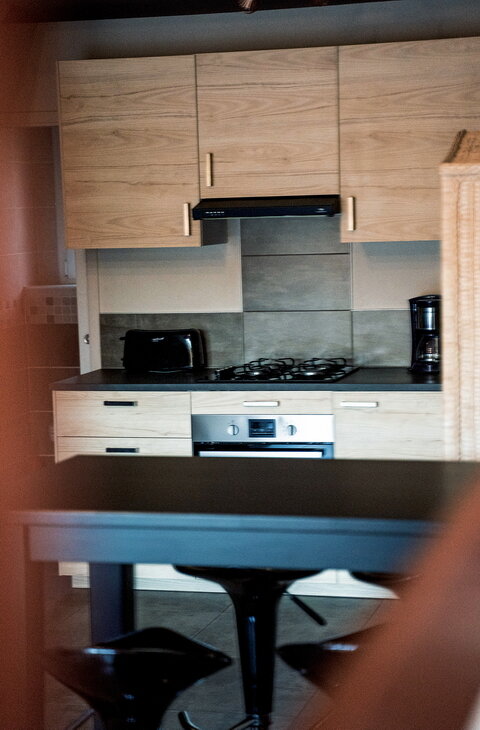 *an open-plan kitchen equipped with crockery, cooking utensils, oven, microwave, gas hob, extractor hood, fridge with freezer, 2 coffee makers, toaster, kettle, electric griddle, table and chairs.