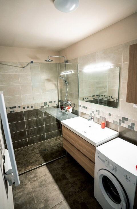 *a bathroom with window and mosquito net, with a 160 cm*90 cm shower, towel rail, hairdryer, large washbasin and storage units, wall-hung WC and washing machine.