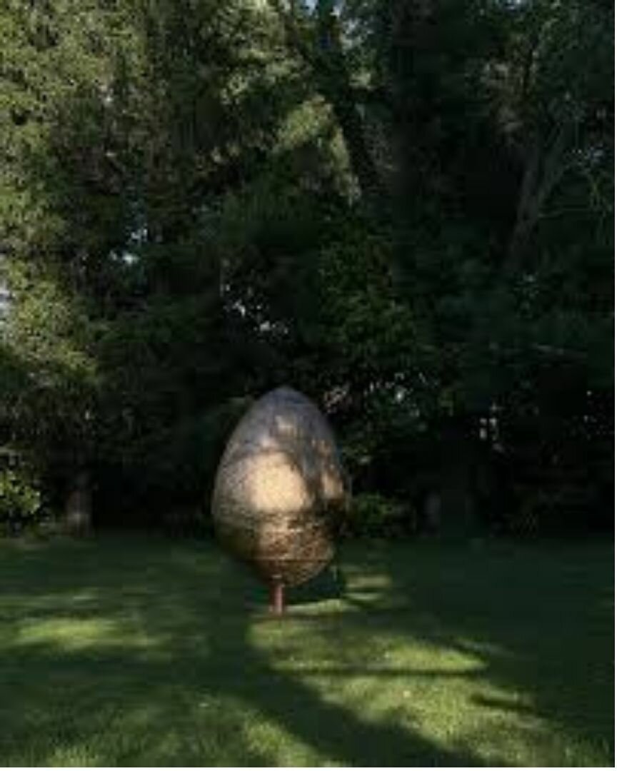 Her research into eggs — free forms, almost archaeological, made with simple materials and then covered in gold — occupies a major place in her work.