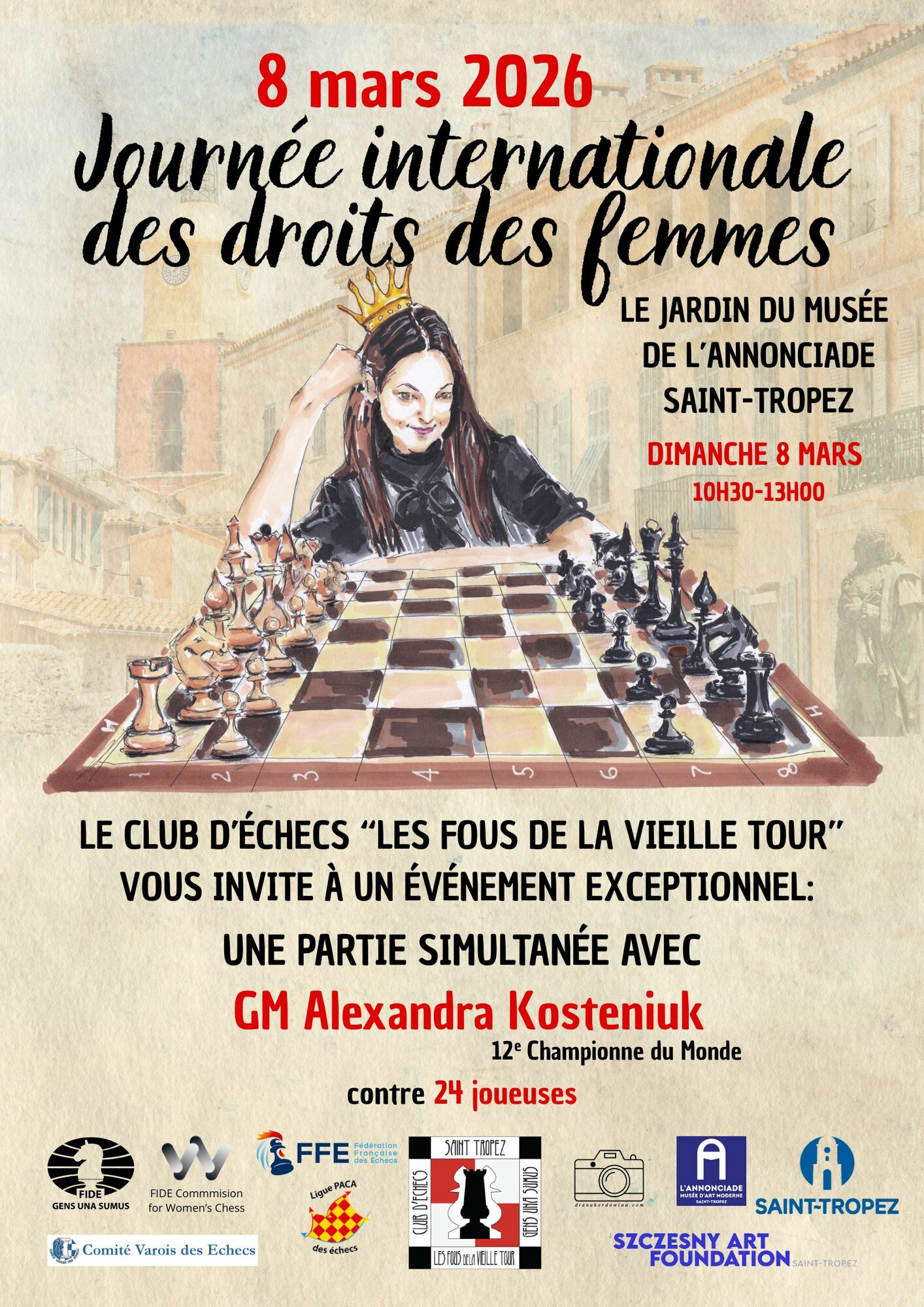 On March 8, to mark International Women's Rights Day, a simultaneous game will be organized with GM Aleksandra Kosteniuk, who will take on 24 players from the local Saint-Tropez club, as well as players from other clubs in the Var region.
