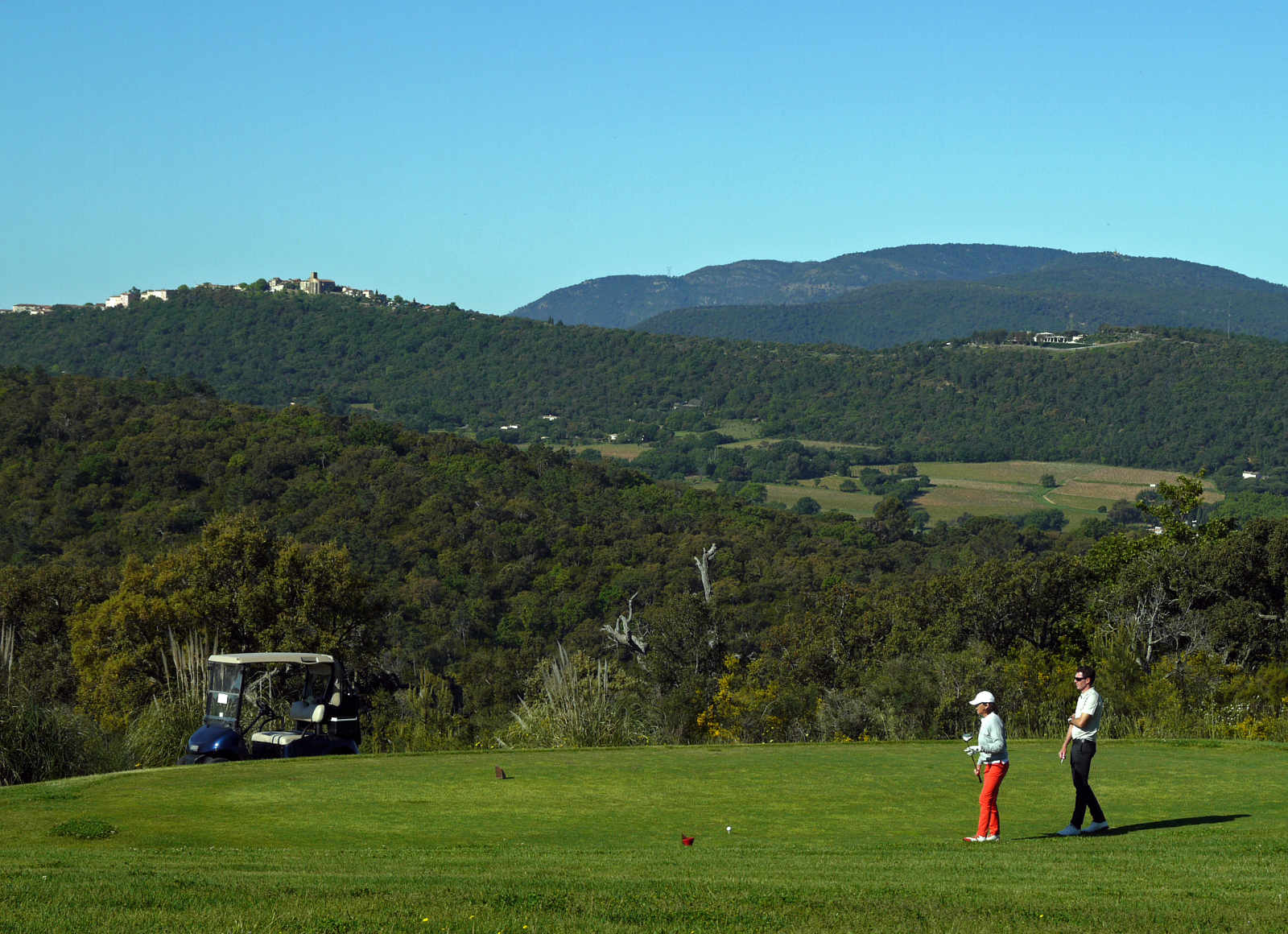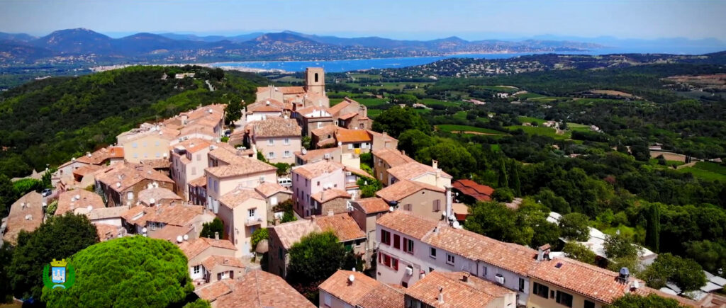 Vue aérienne de Gassin avec, en arrière-plan, les vignes, la fôret et le golfe de Saint-Tropez
