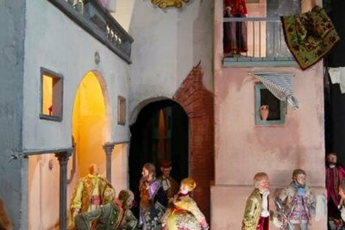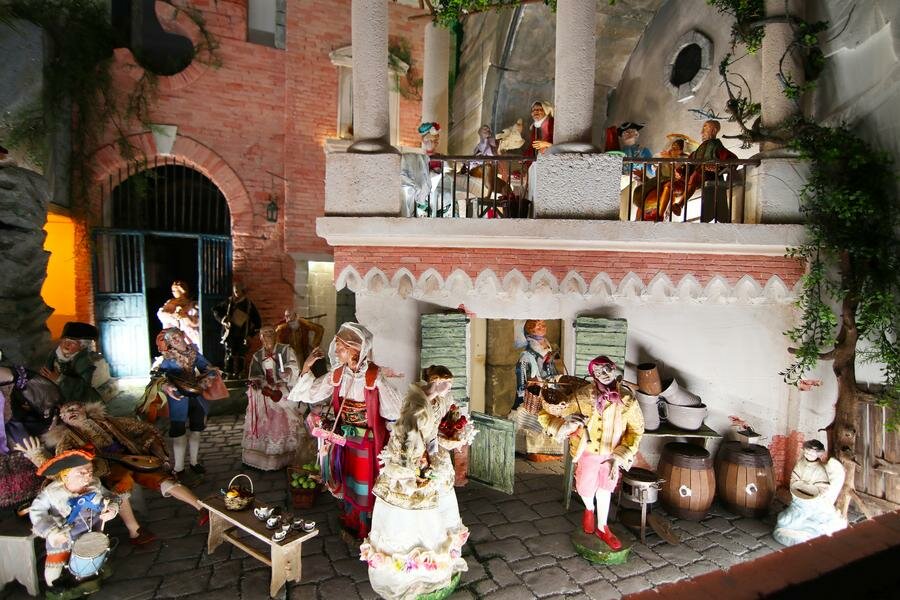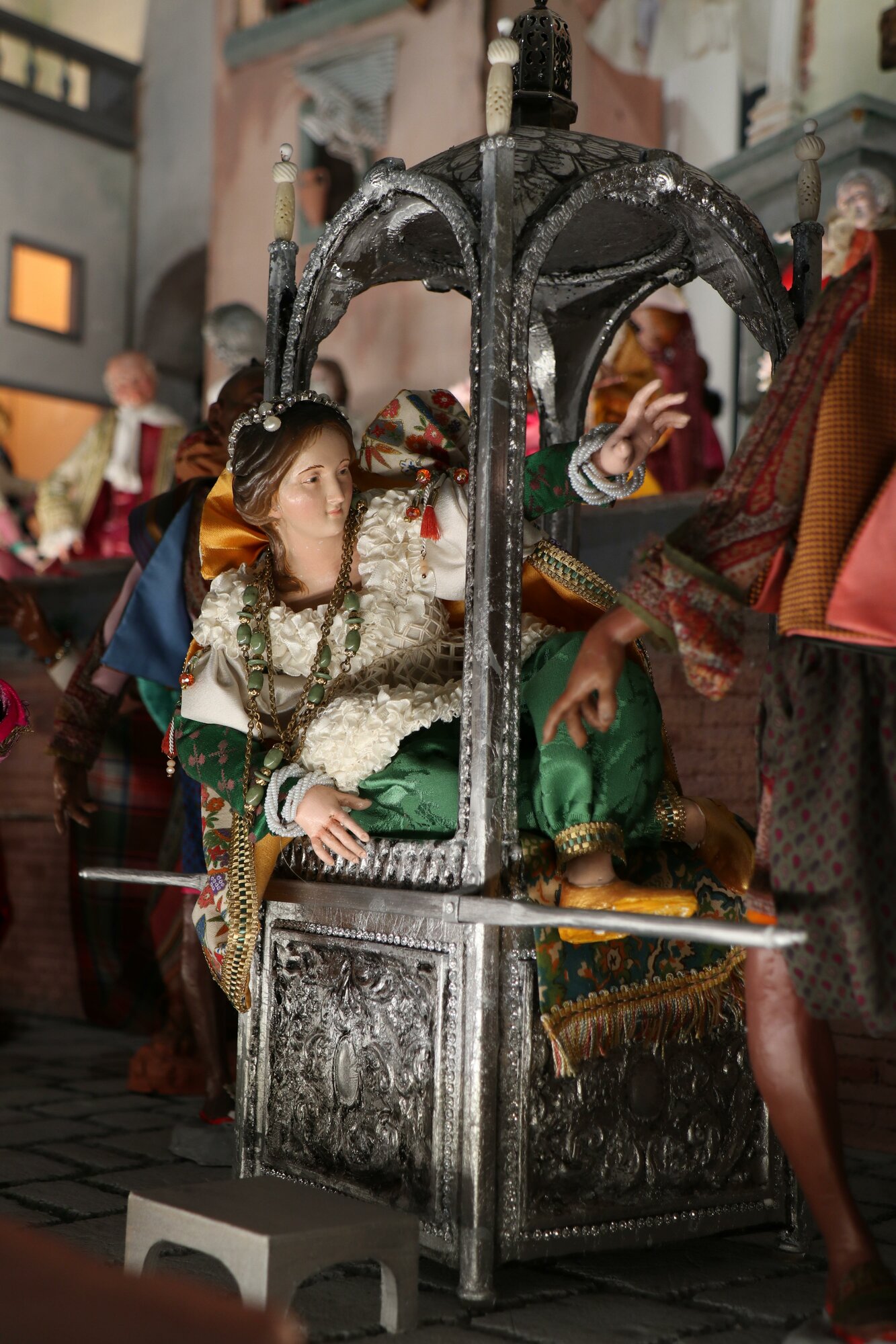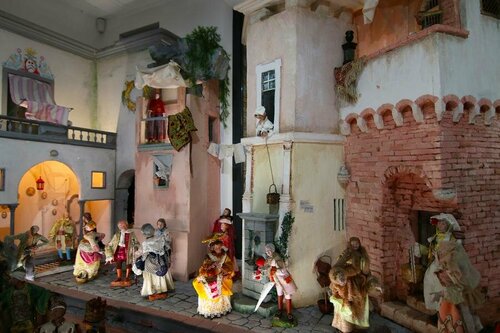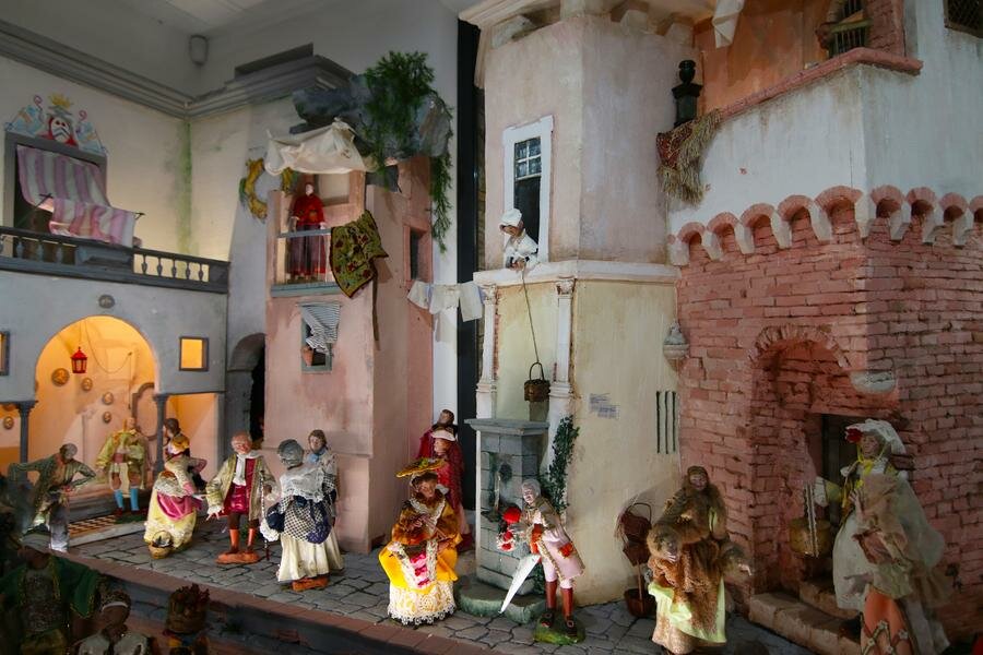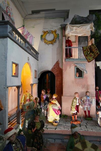 La crèche napolitaine (presebbio napulitano), est une tradition artisanale qui s’est affirmée à la fin du XVIe siècle. Elle devient un phénomène de société et connaît son âge d’or au XVIIIe siècle. La théâtralité est la marque de la crèche napolitaine où les éléments sacrés se mêlent au profane avec des personnages de la vie quotidienne.