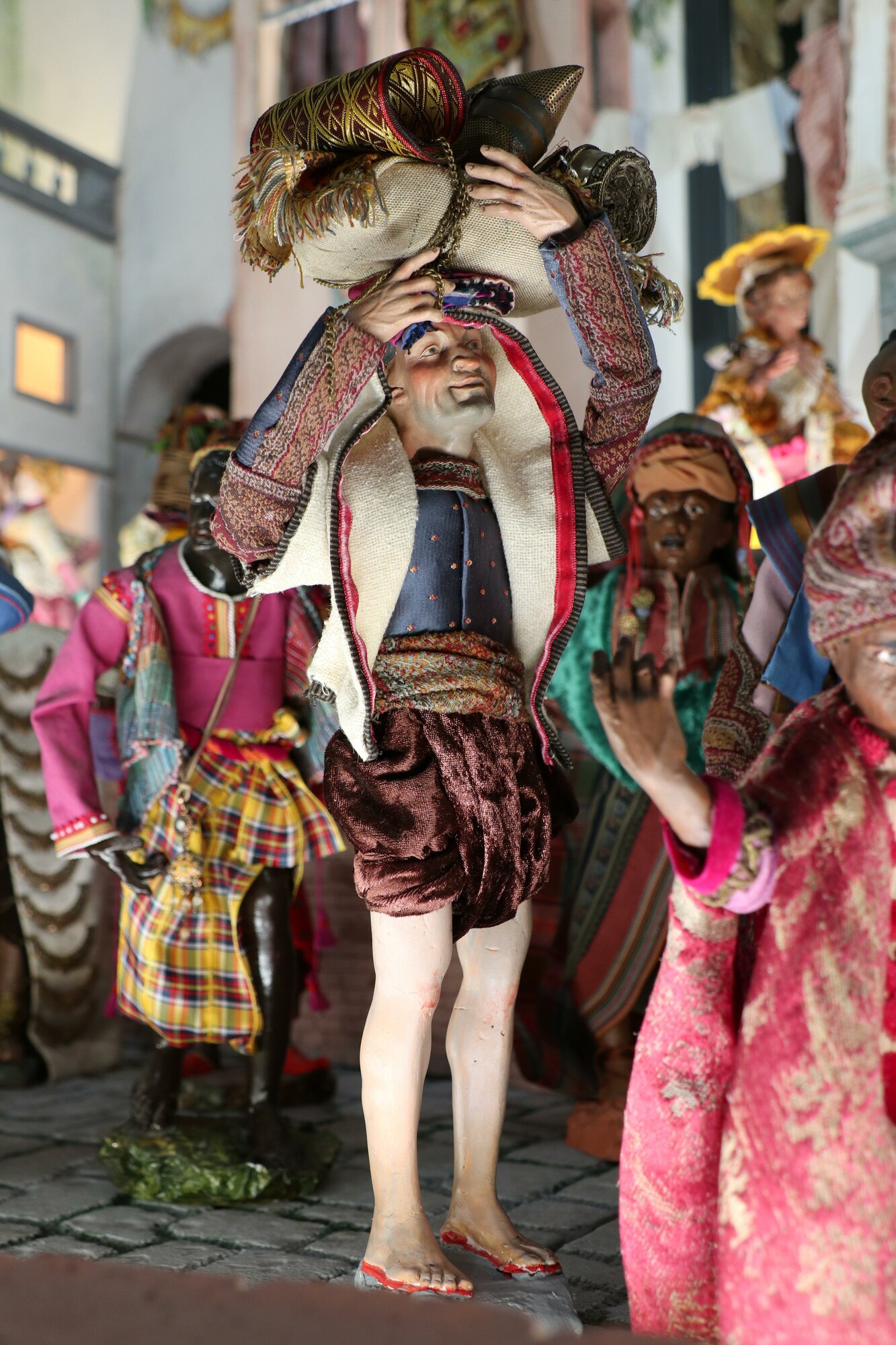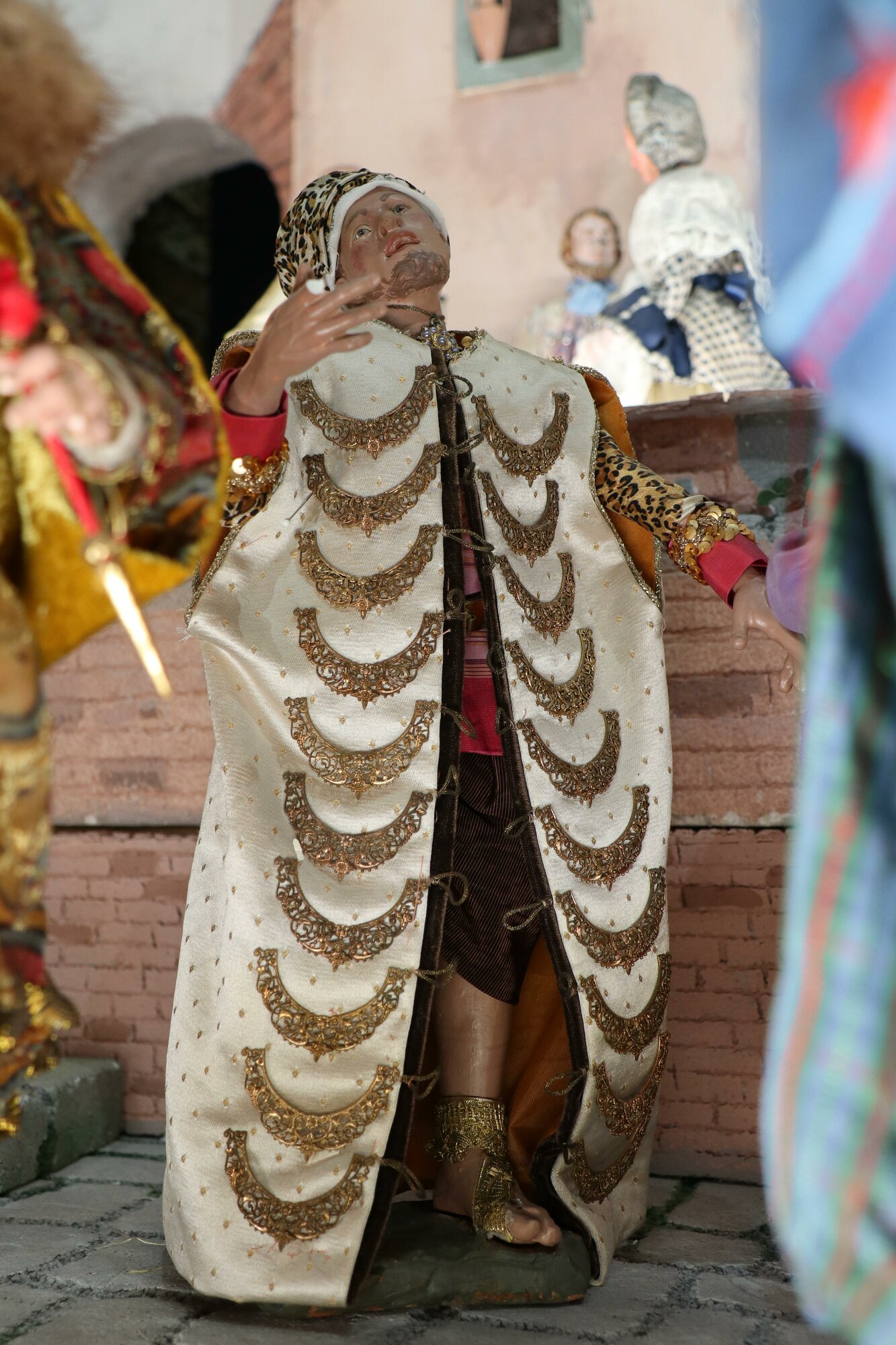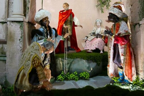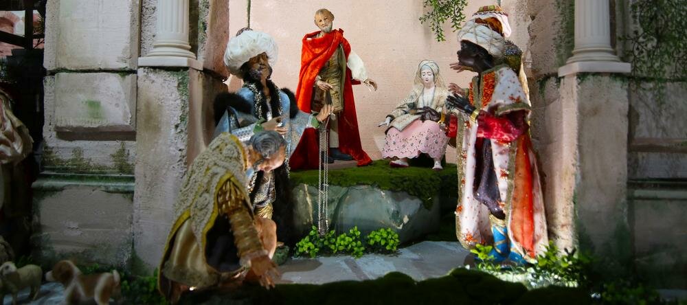 À l’orée du XVIIe siècle, relevant de la plus haute fantaisie, la tradition du « presepe » s’installe véritablement à Naples. L’action première de ce cheminement fut de positionner l’émergence du christianisme sur des ruines antiques. Les Rois Mages et leur suite composée de courtisans et d’esclaves sont la particularité des crèches napolitaines.