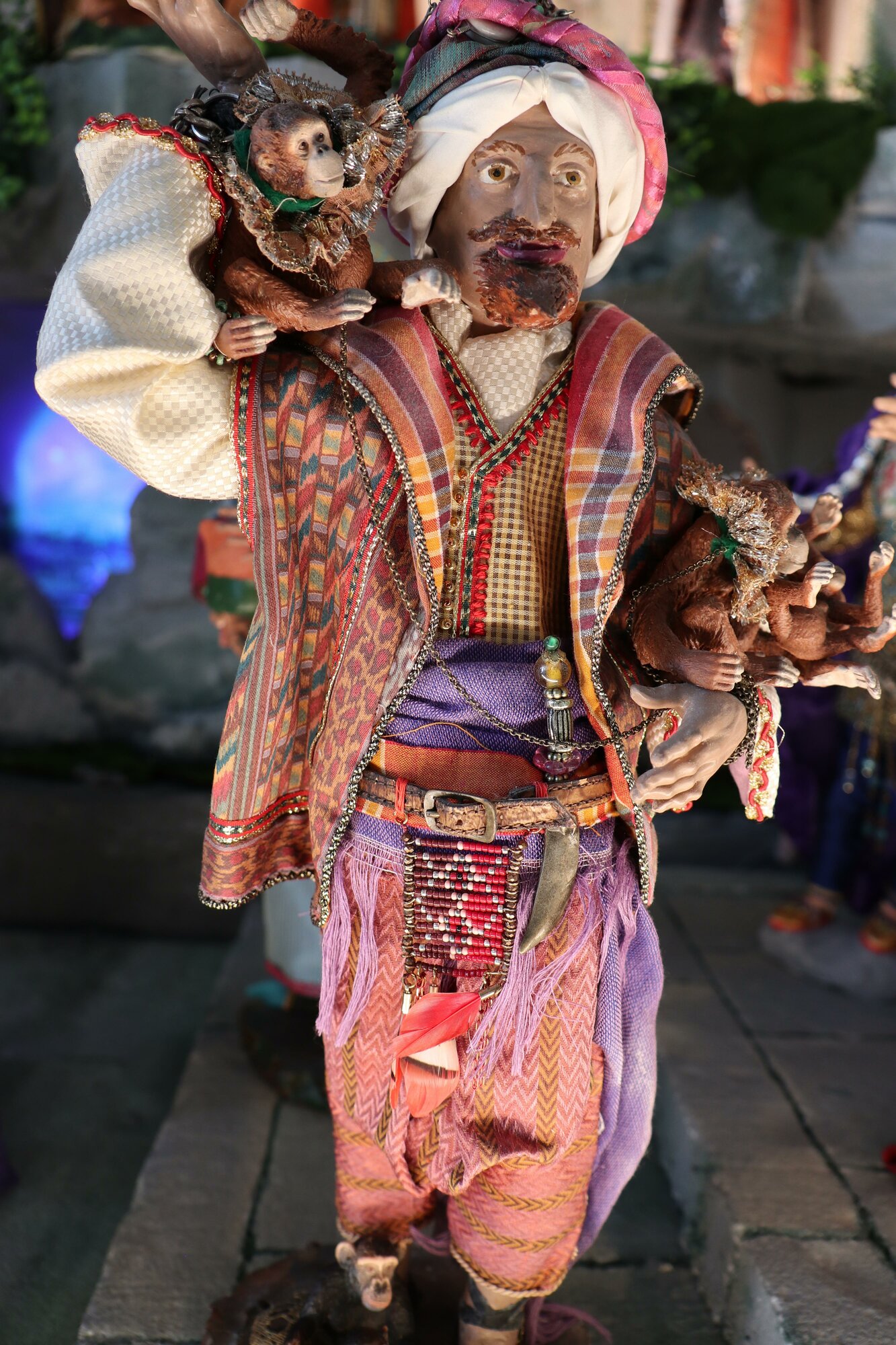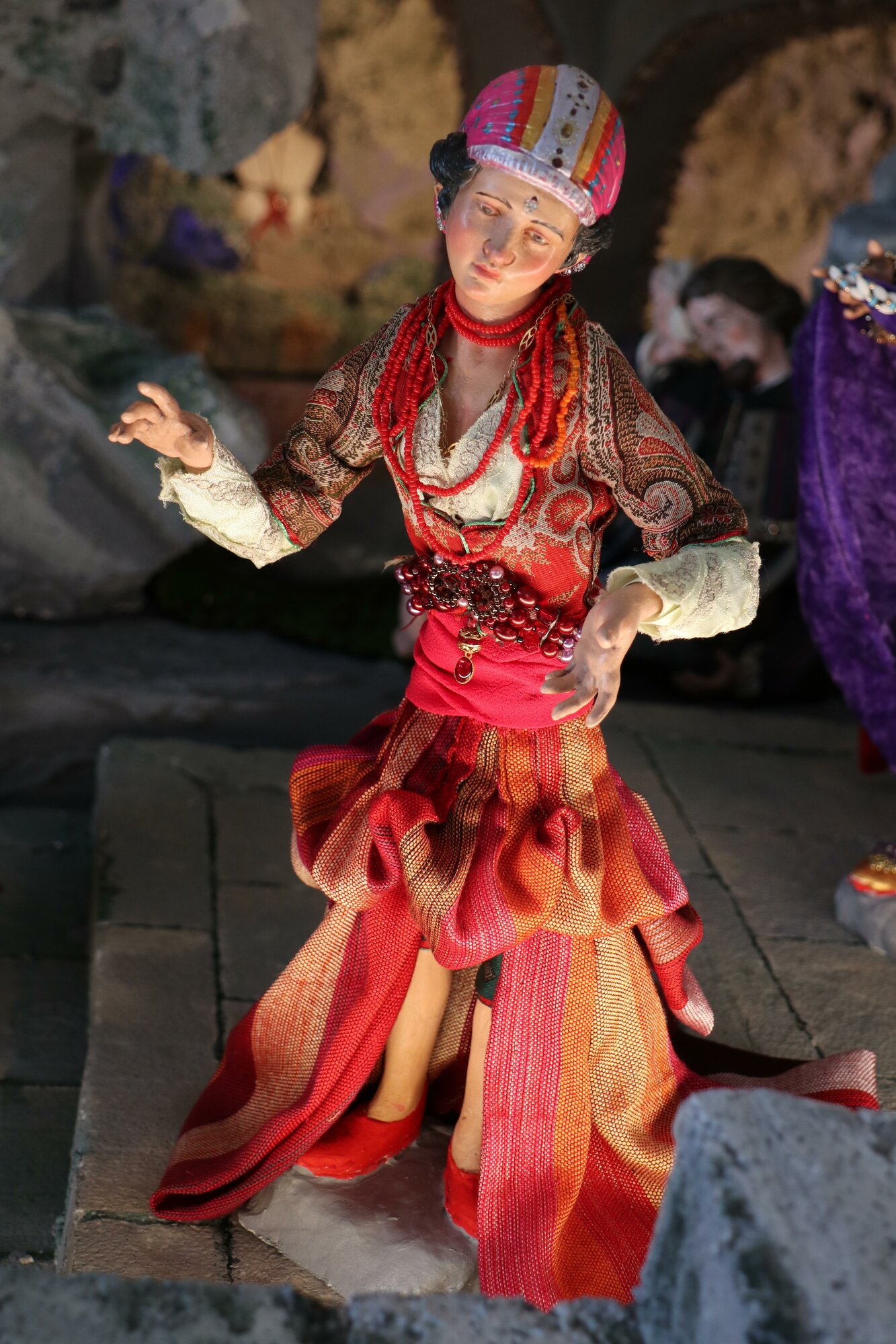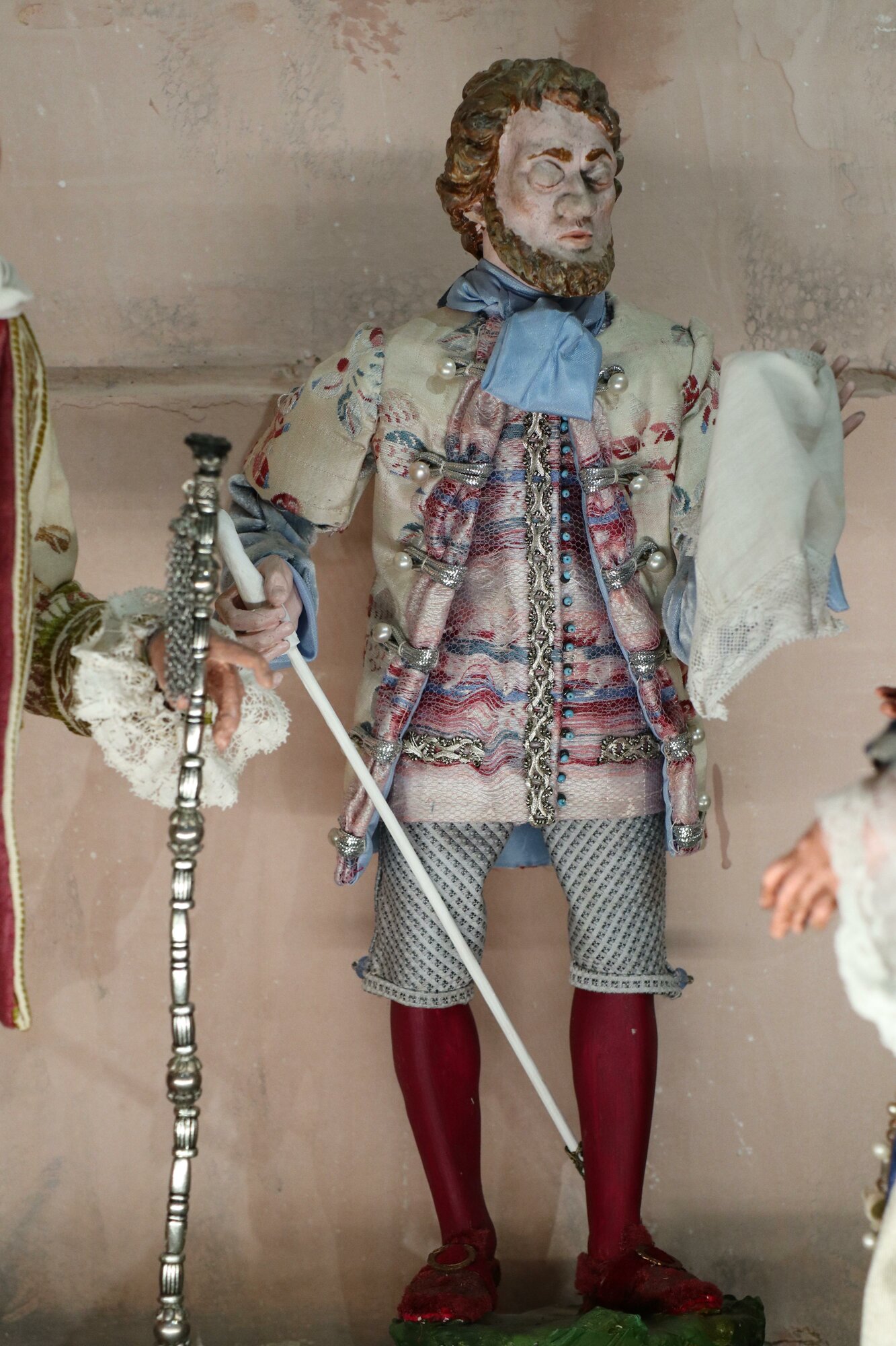 À l’orée du XVIIe siècle, relevant de la plus haute fantaisie, la tradition du « presepe » s’installe véritablement à Naples. L’action première de ce cheminement fut de positionner l’émergence du christianisme sur des ruines antiques. Les Rois Mages et leur suite composée de courtisans et d’esclaves sont la particularité des crèches napolitaines.