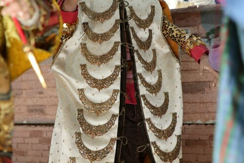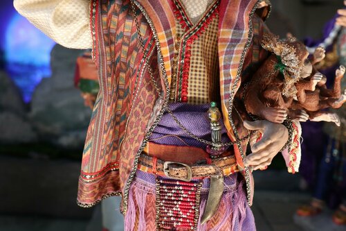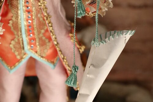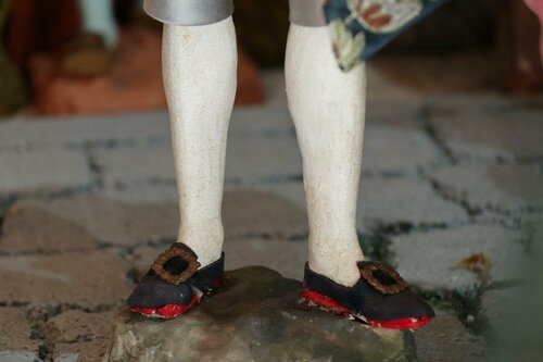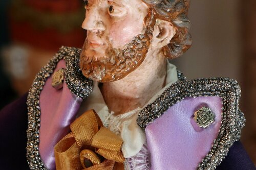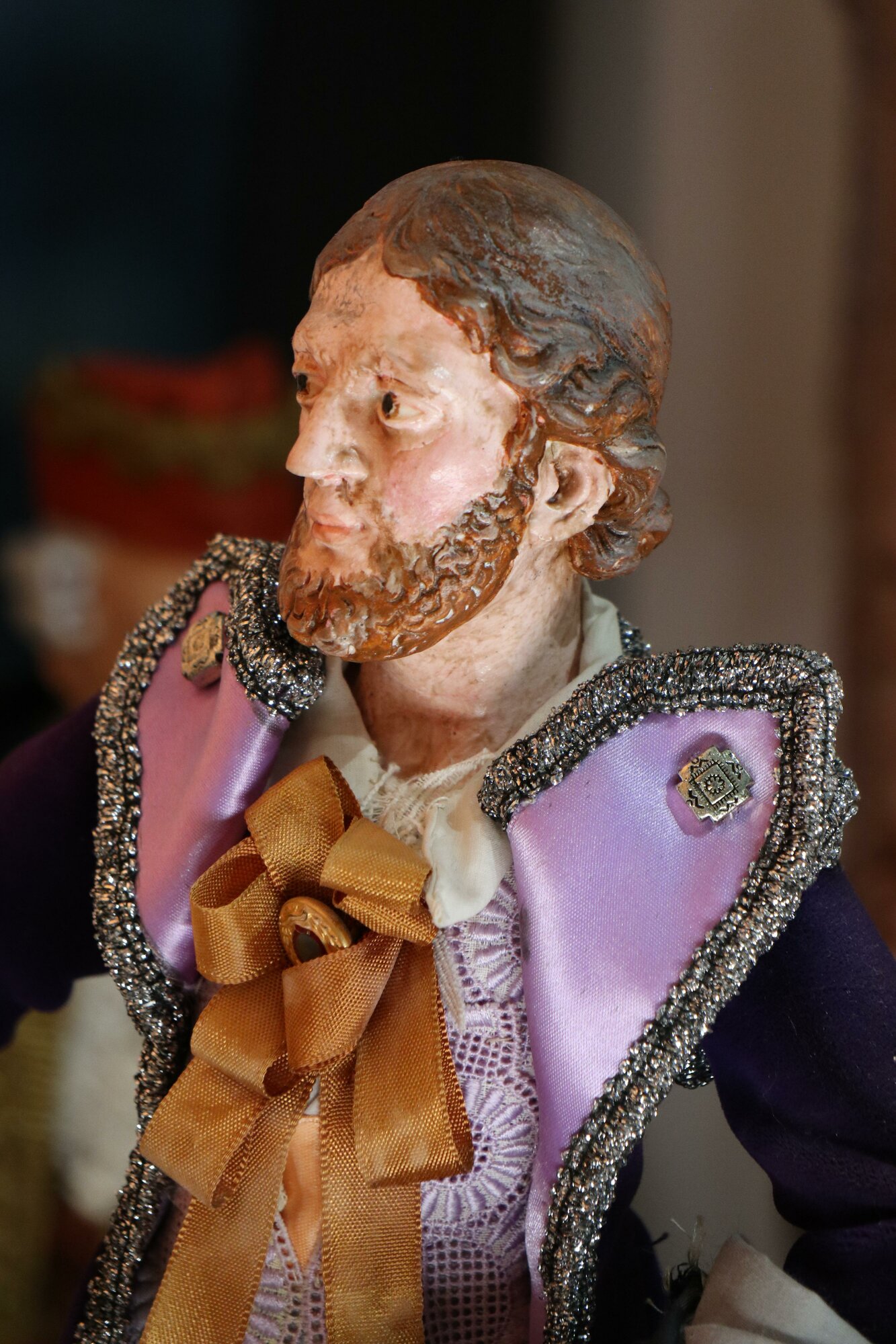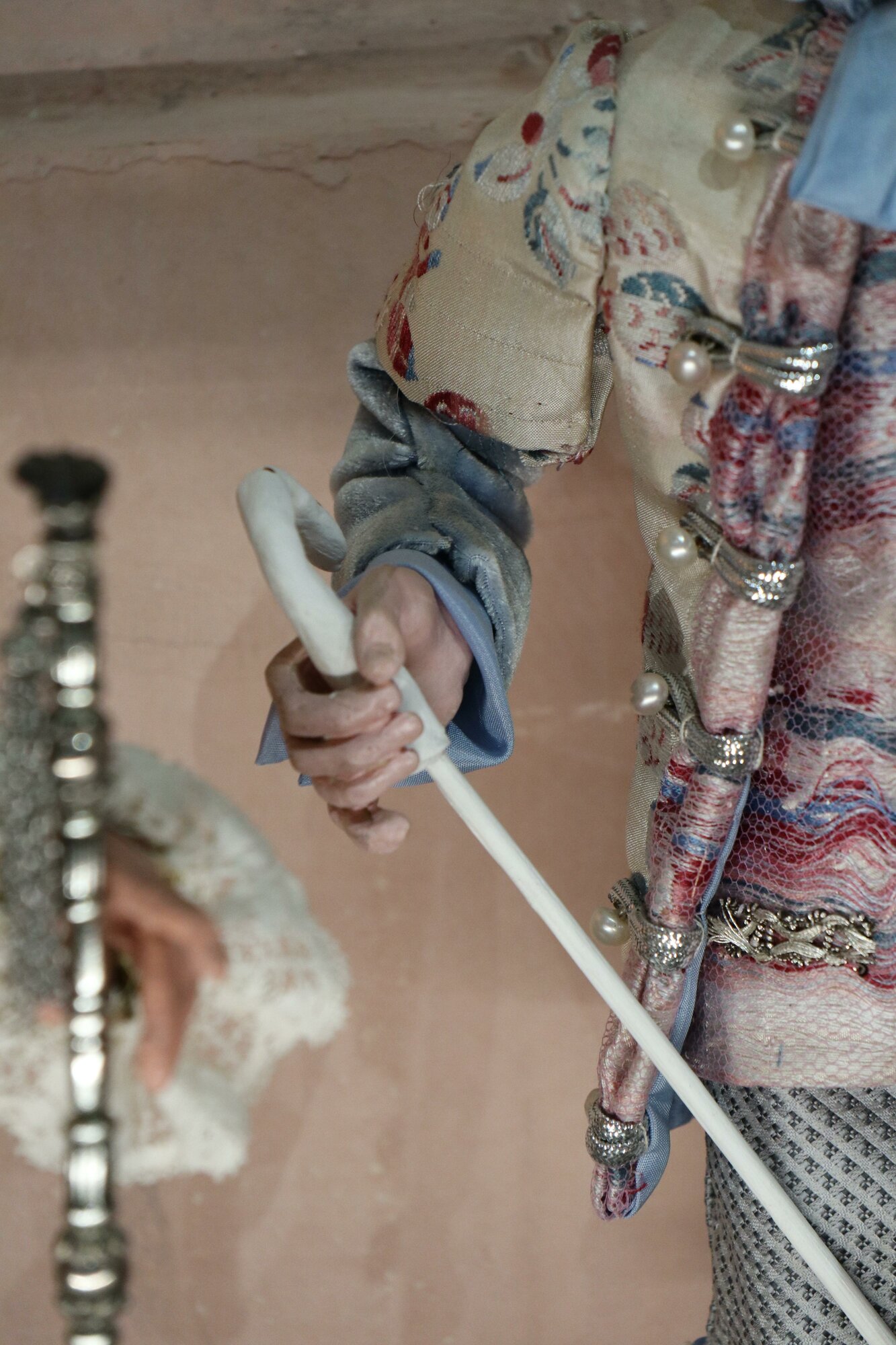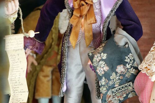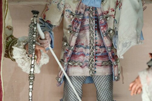 Les habits font l’objet de tout autant de soins de la part de l’artiste. Il utilise des tissus de grande qualité en privilégiant les tissus anciens pour confectionner des vêtements conformes au statut des personnages.