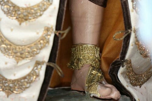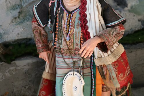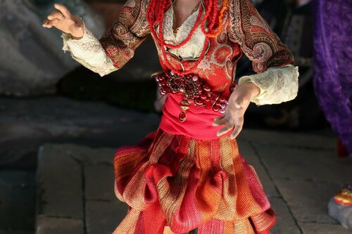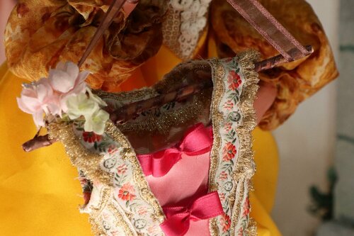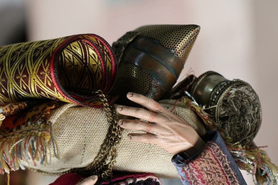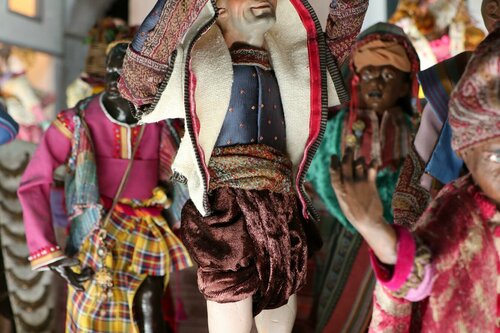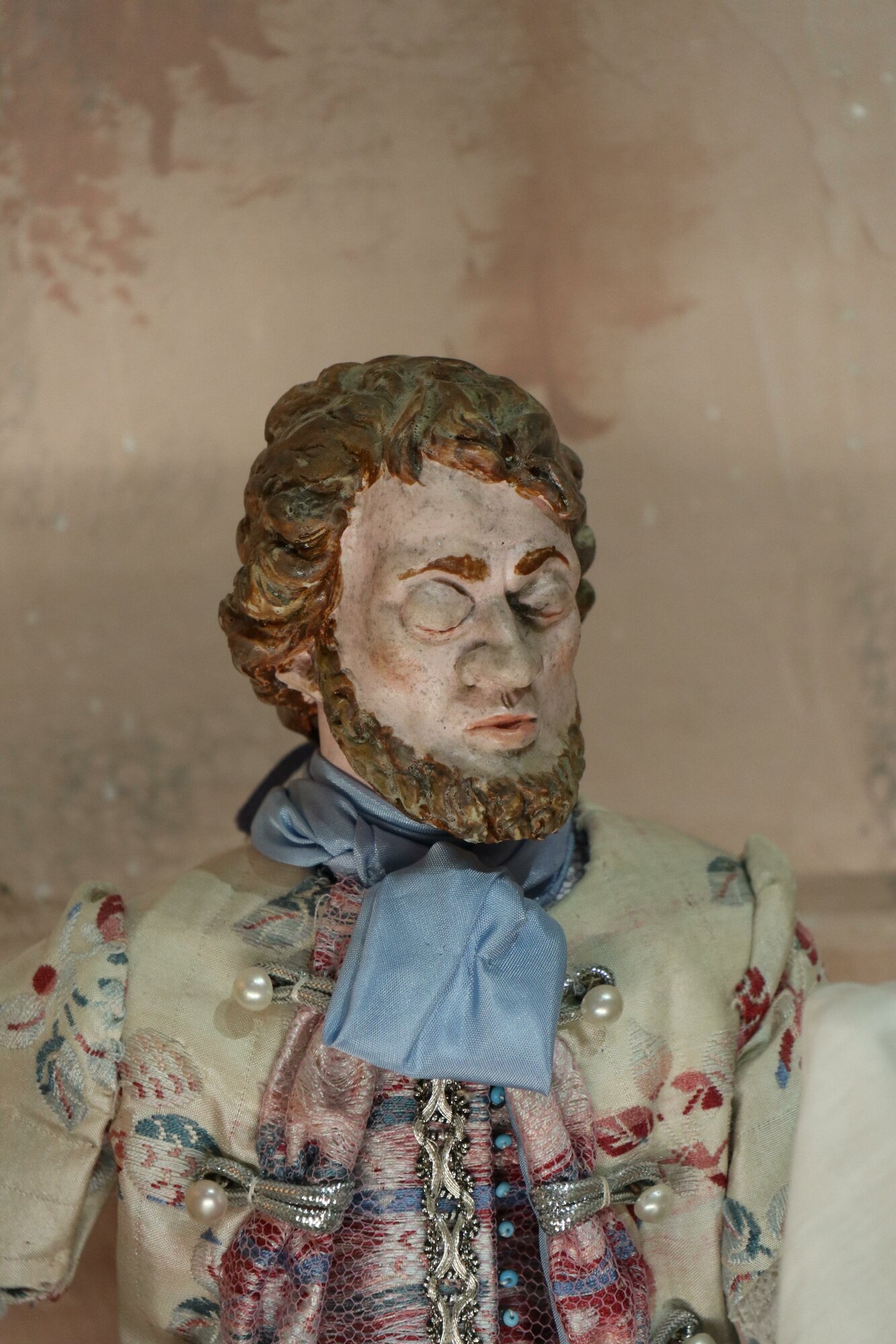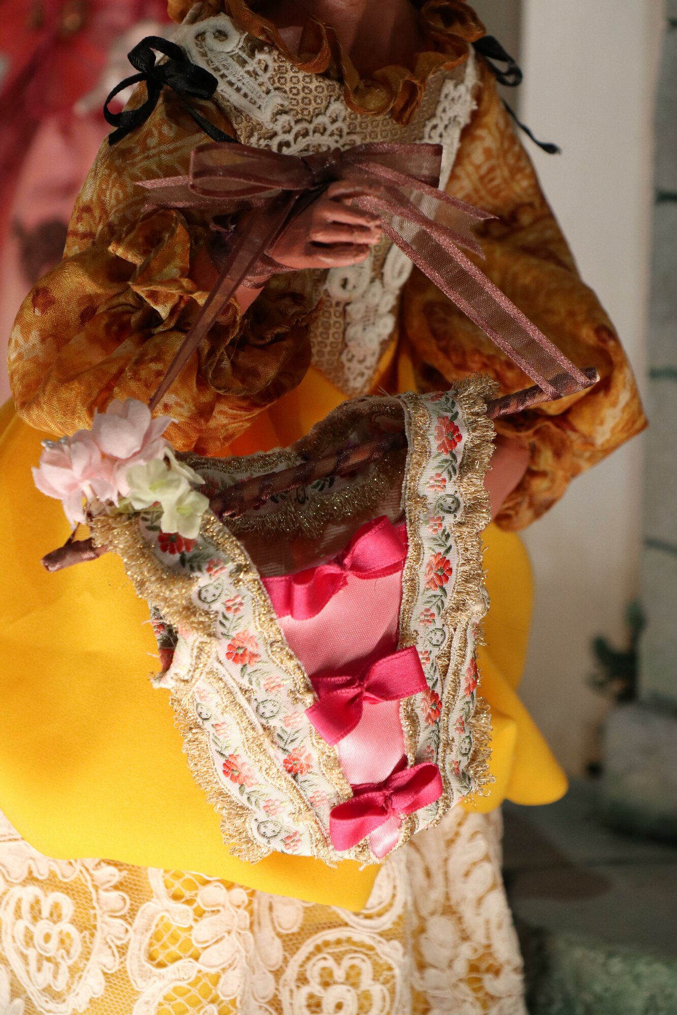 Les habits font l’objet de tout autant de soins de la part de l’artiste. Il utilise des tissus de grande qualité en privilégiant les tissus anciens pour confectionner des vêtements conformes au statut des personnages.