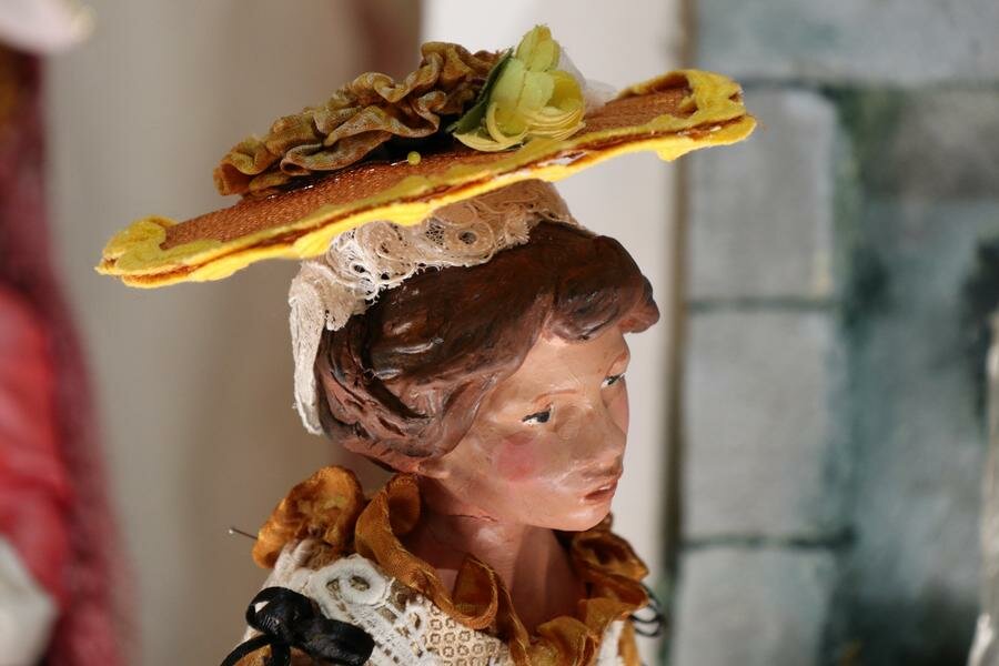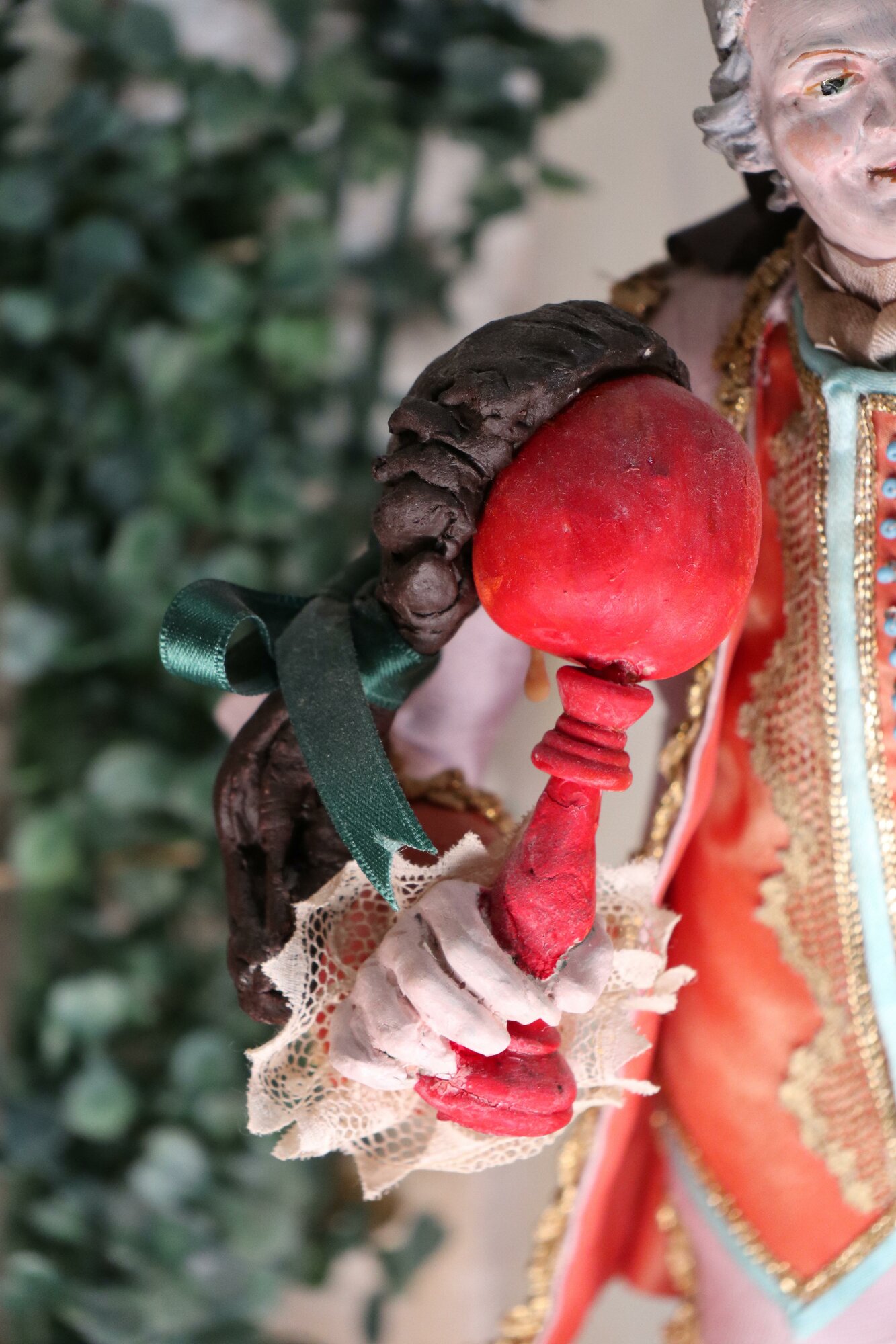 La création d’un santon nécessite environ un mois de travail, comprenant la création du corps et le costume. Sous les doigts de Christian-Léandre Ganga naissent ainsi les métiers de l’artisanat : boucher, boulanger, mais ce qui lui plaît particulièrement, c’est de faire vivre les métiers de service auprès de l’aristocratie (les perruquiers, gantiers, parfumeurs et autres chapeliers…).