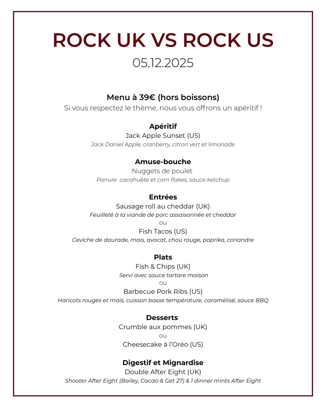 Pour l’occasion, notre équipe a imaginé un menu spécial à 39€ (hors boissons) avec à chaque fois un choix entre deux plats : une option UK et une option US.