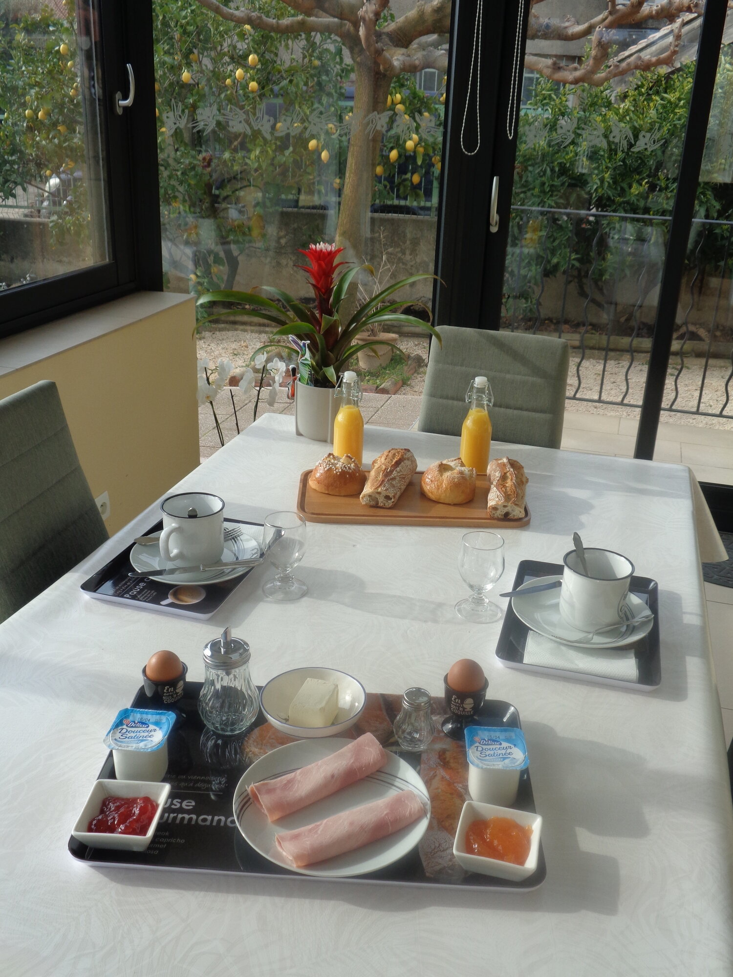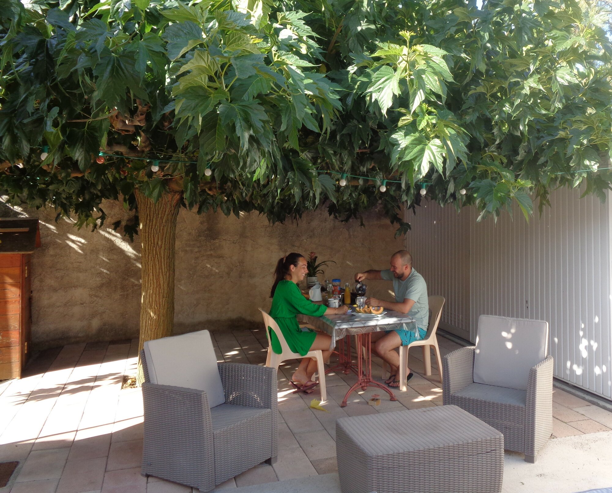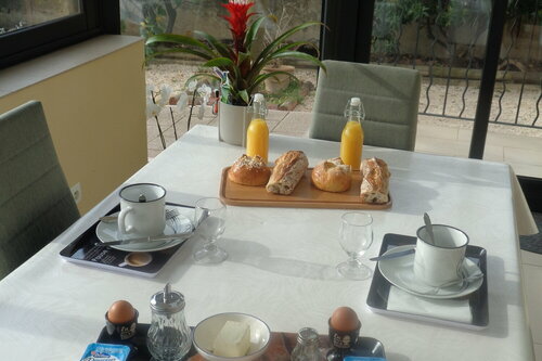 Eliane et Cacalou vous proposent le service du petit déjeuner de 7h30 à 9h30 sur la terrasse ombragée ou dans la véranda climatisée.