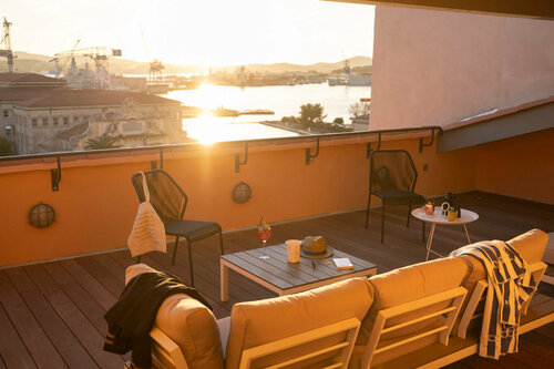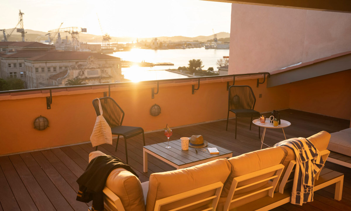 Un rooftop en guise de pont supérieur, avec bassin extérieur, solarium, cabine de soin et vues sur la Méditerranée, la vieille ville et le Mont Faron.
