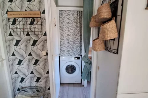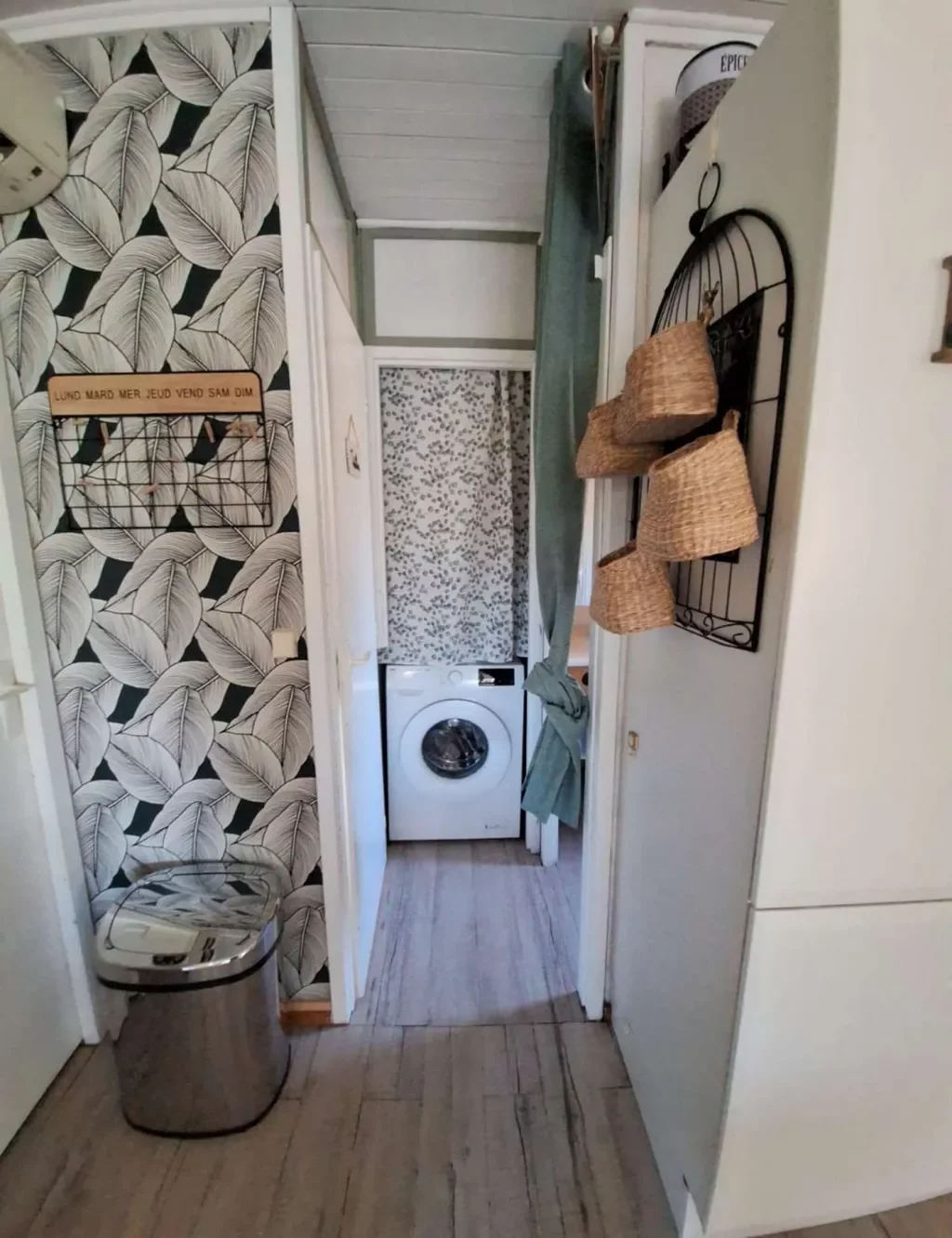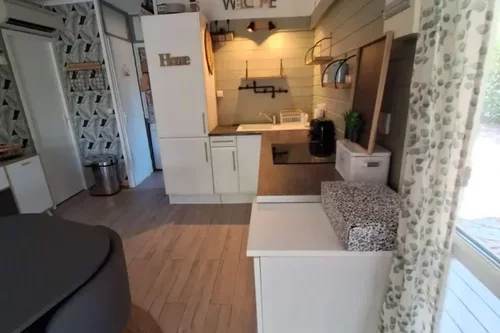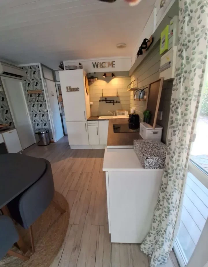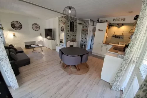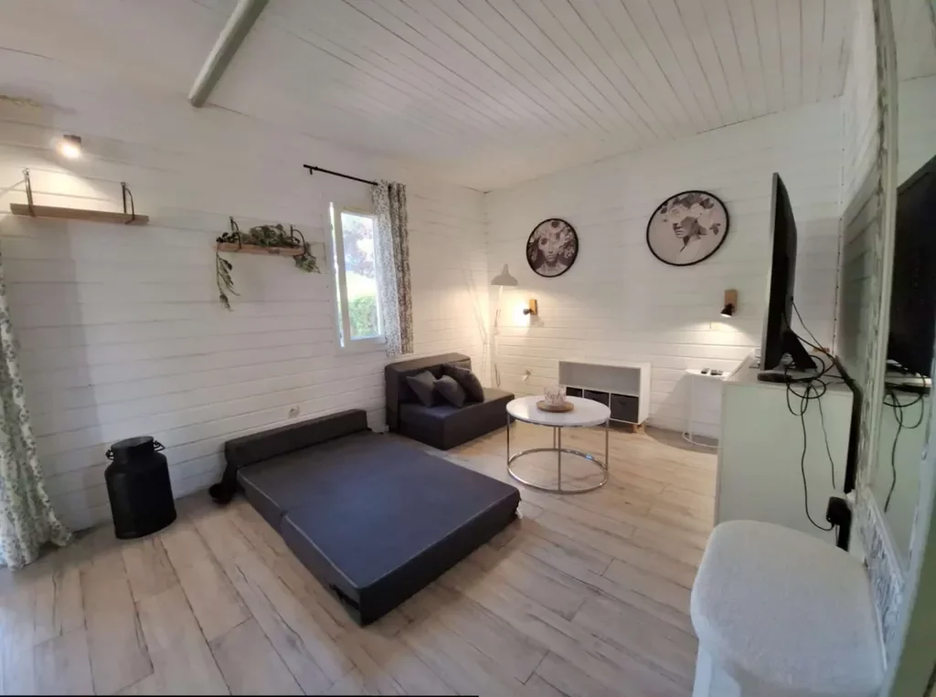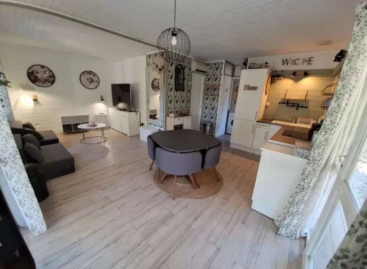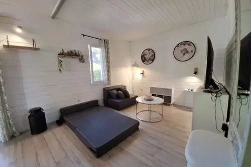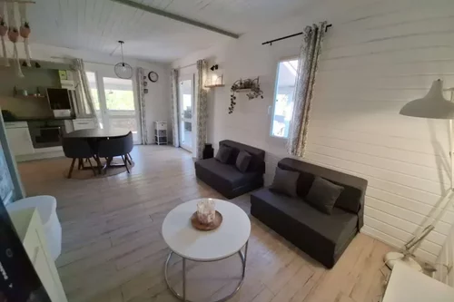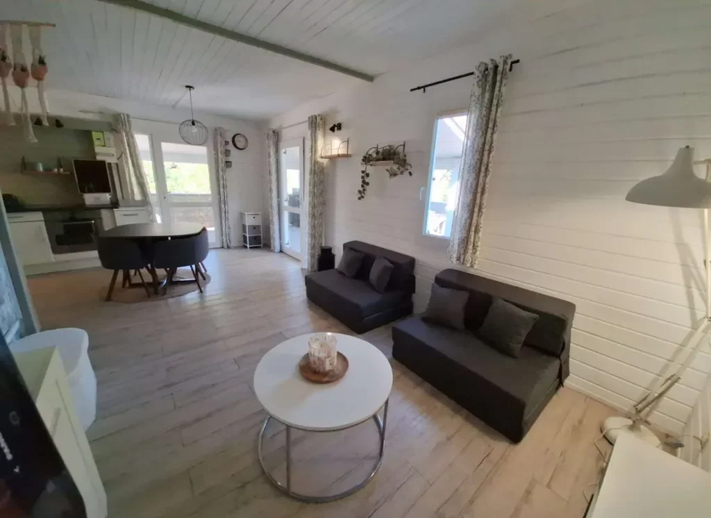 À l’intérieur, vous découvrirez une pièce de vie lumineuse, ouverte sur l’extérieur grâce à de larges baies vitrées. La terrasse couverte est aménagée avec un coin repas convivial. Le salon-séjour, spacieux et confortable, est équipé d’un canapé convertible et d’un grand écran plat, idéal pour vos soirées en toute tranquillité.