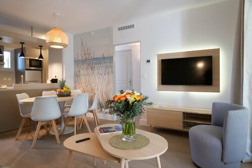 Les logements sont équipés d’une cuisine avec îlot central, d'un séjour avec canapé convertible, d'une jolie salle de douche à l'Italienne, wc séparé, et de 2 chambres.Terrasse couverte avec table, chaises et transats. Un jardin pour profiter pleinement de votre séjour si vous choisissez un rez de jardin, climatisation, lits fait à l'arrivée et produits d'accueil.