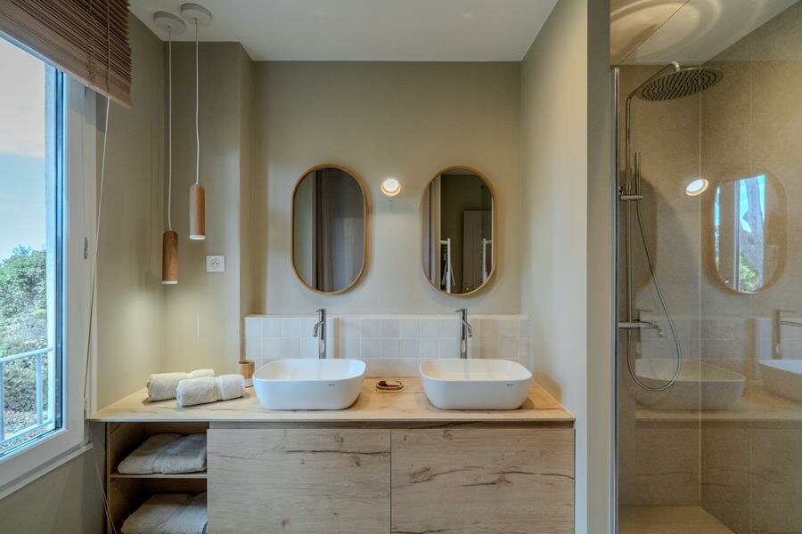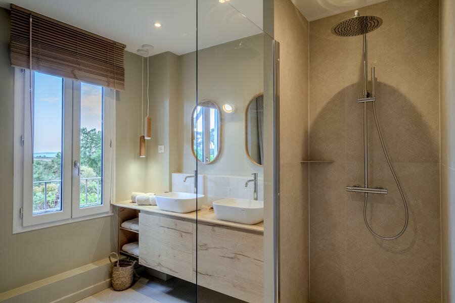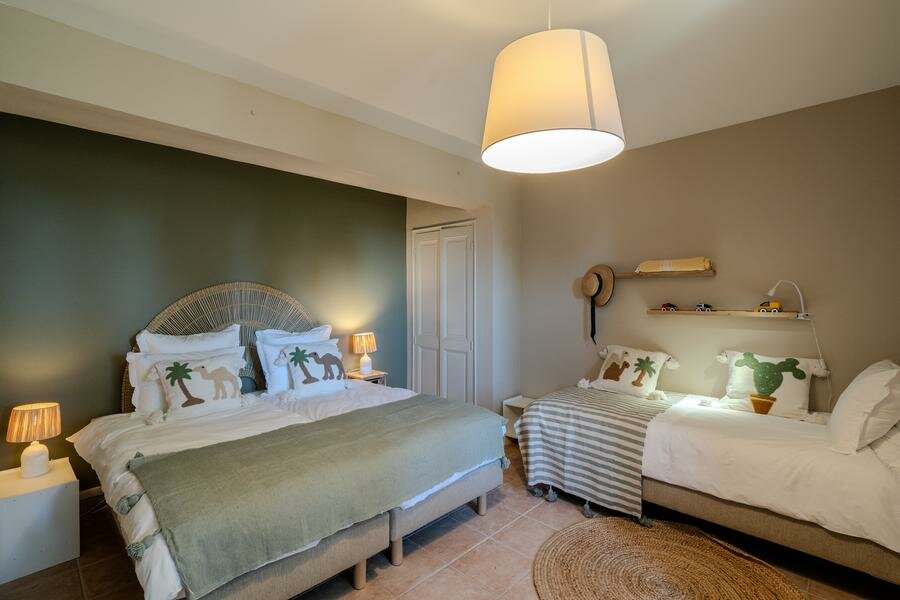 Les 2 chambres à l’étage peuvent accueillir 5 personnes avec une grande salle de bain avec baignoire.