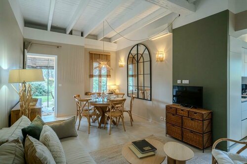 Ce duplex cosy 3* comporte une pièce de vie moderne et chaleureuse, donnant de plain-pied sur la terrasse au sud et ayant un accès direct à la piscine chauffée partagée.