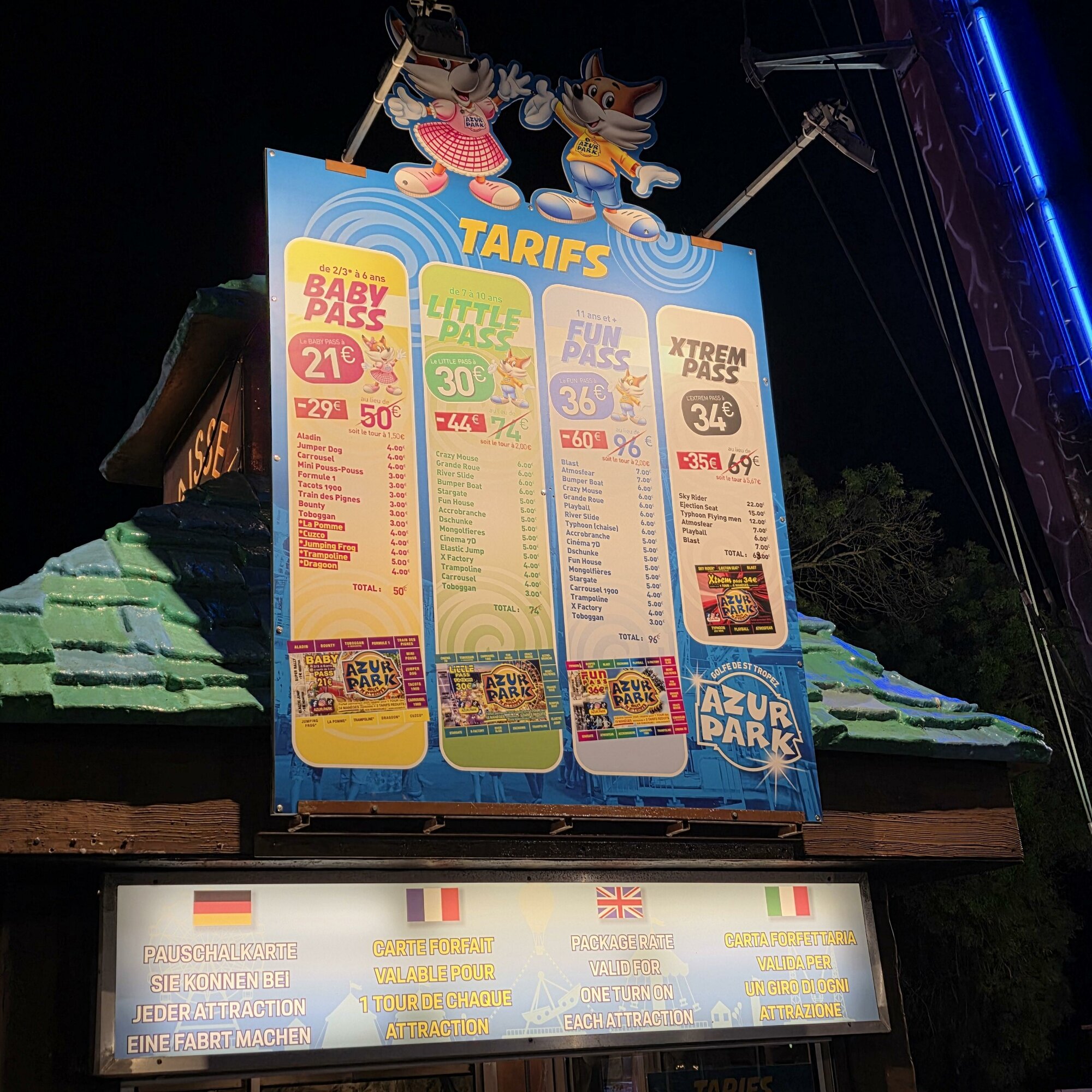 Azur Park vous propose 35 attractions dont une quinzaine pour enfants pour émerveiller petits et grands. 4 pass sont à disposition pour des tarifs attractifs. Le parc vous propose 2 mini-golf, des points de restauration et tout pour une soirée réussie.