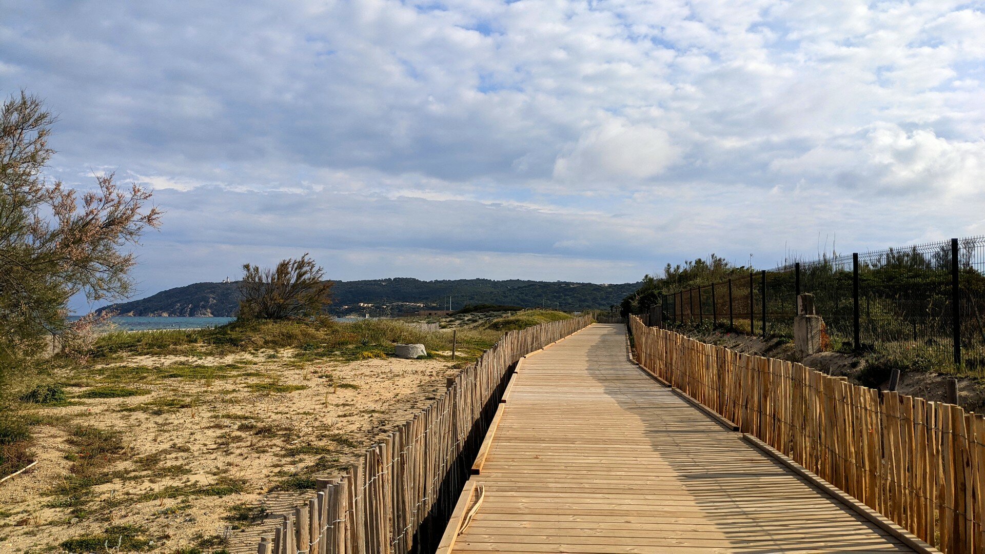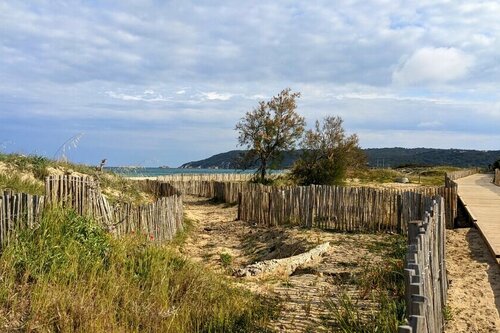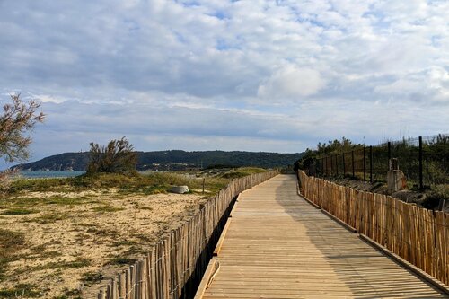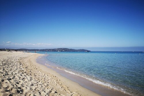 Longue plage de sable fin (4,5 km), classée 'espace naturel remarquable' à l'origine du 'mythe tropézien' : on s'y baigne, on s'y dore, on s'y restaure, on y danse aussi…