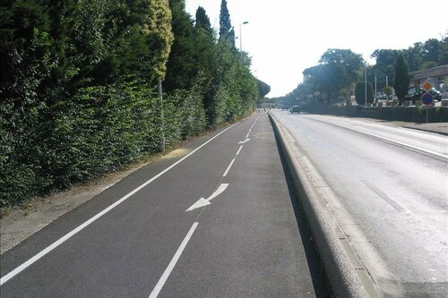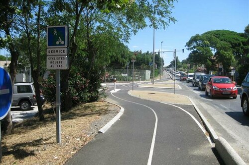 - Piste cyclable :site propre réservé aux cycles à deux ou trois roues, indique aux piétons et aux conducteurs des autres véhicules qu'ils n'ont pas le droit d'emprunter cet aménagement ni de s'y arrêter (exception faite des véhicules de secours, pompiers, police, véhicule de service et sur certains tronçons aux riverains autorisés et cyclomotoristes). En l’absence de trottoirs ou d’accotements praticables, les usagers non motorisés (piétons, rollers, personnes à mobilité réduites…) doivent cheminer sur la partie gauche de la chaussée.