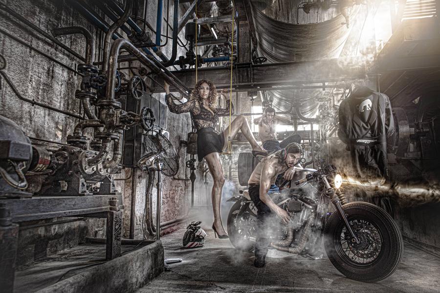 Rapidamente, ancor prima di aver conseguito la patente di guida, si dotò di un furgone (ne avrebbe avuti dieci!) traboccante di un'attrezzatura variegata: generatore, luci, morsetti, scale, cavi, argano, corde, treppiede, cannelli e, soprattutto, robuste valigie contenenti le sue preziose macchine fotografiche e i suoi obiettivi, e si mise in viaggio per le strade, nei capannoni, nei parcheggi e in tutti i luoghi più impensati per realizzare le sue messe in scena dove "i trucchi si fanno senza trucchi", come diceva lui.