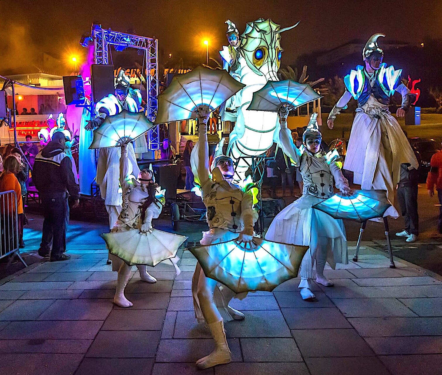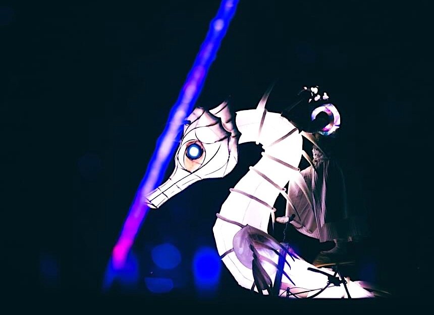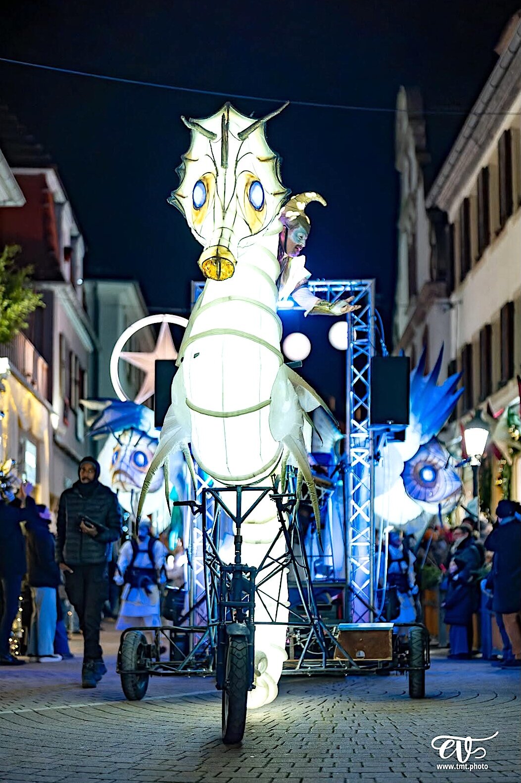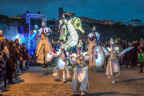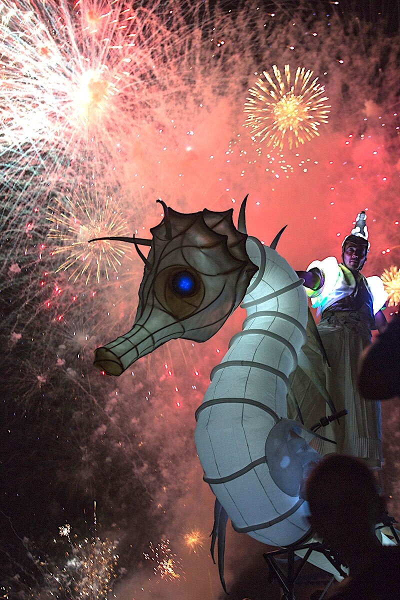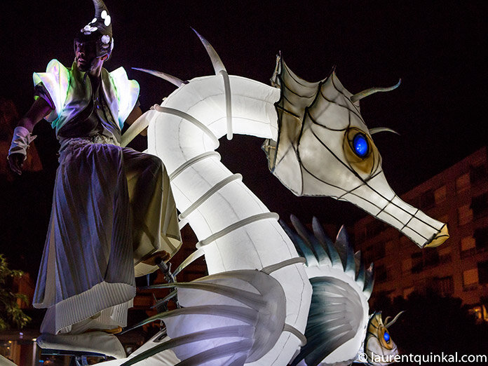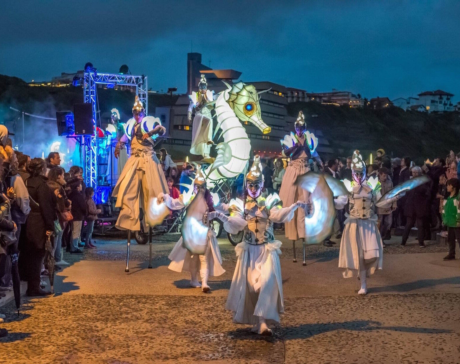 Un'impressionante processione di luci si muove nella notte, trasportata dai ritmi di Taikos e dai suoni elettronici. Una via lattea di meduse, stelle scintillanti e un maestoso cavalluccio marino, accompagnati da trampolieri, guidano con orgoglio il galleggiante Océanis.