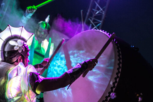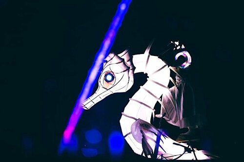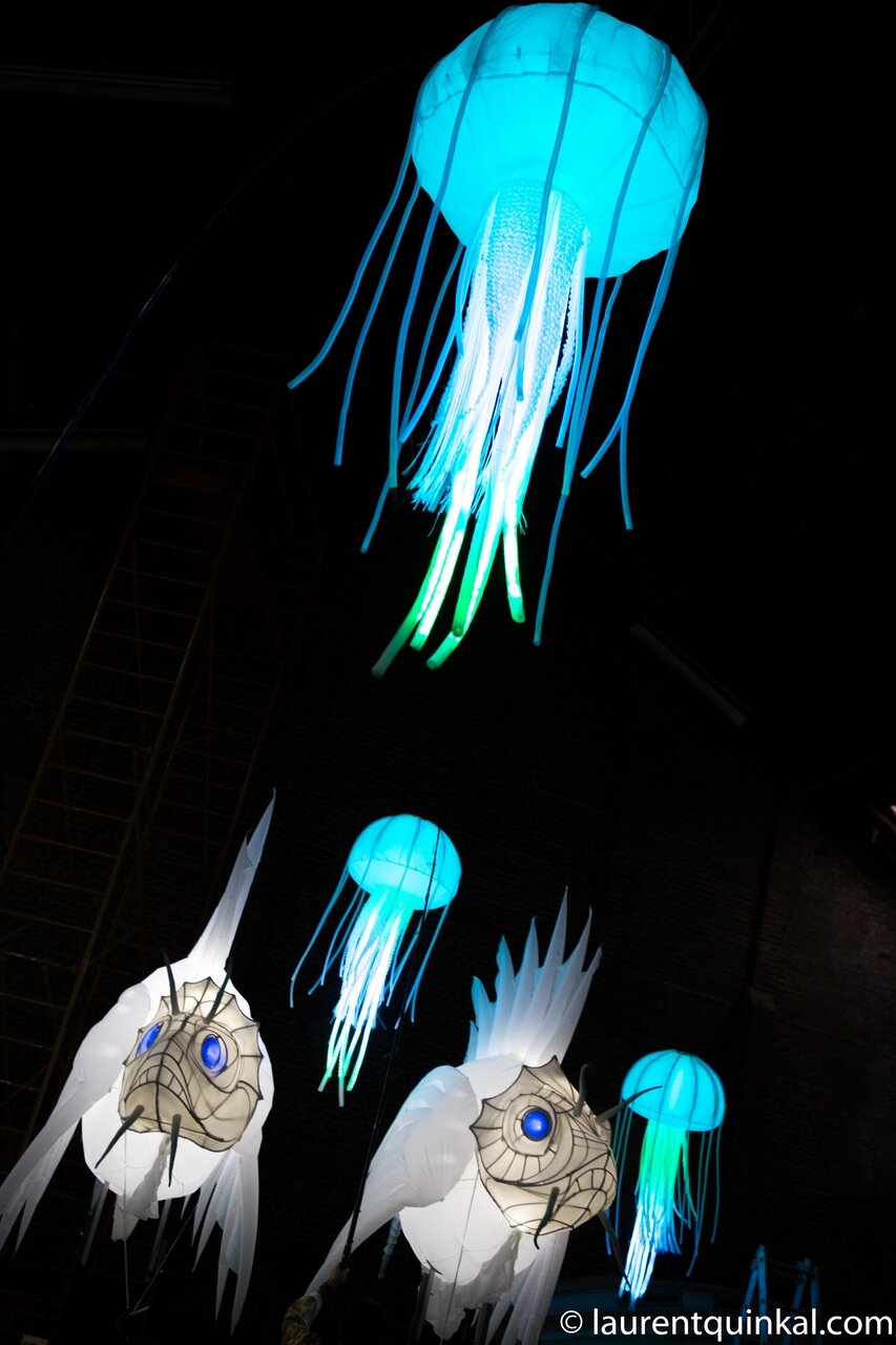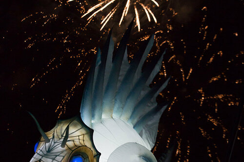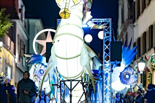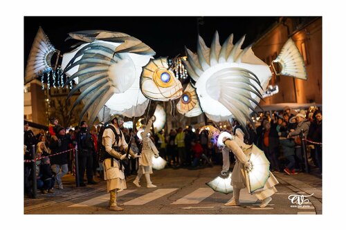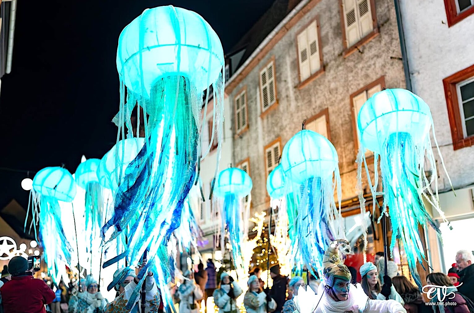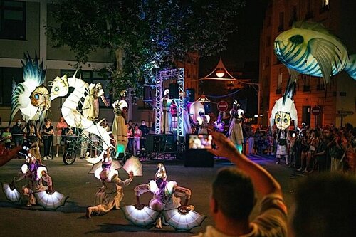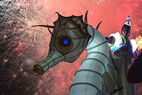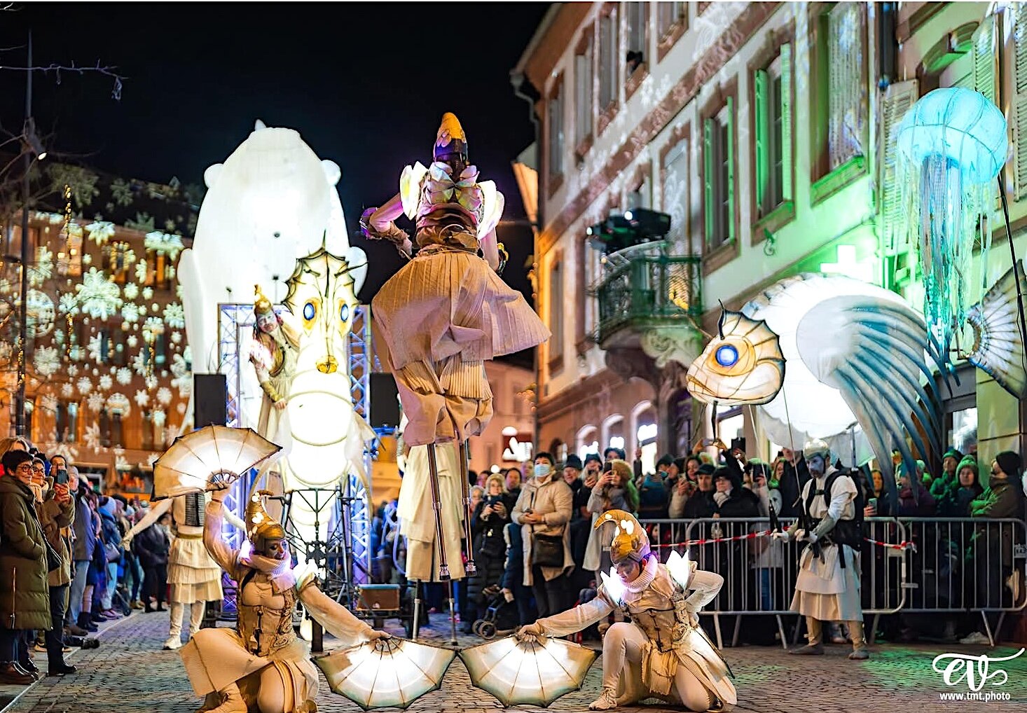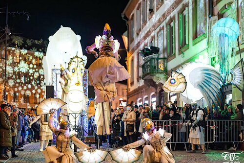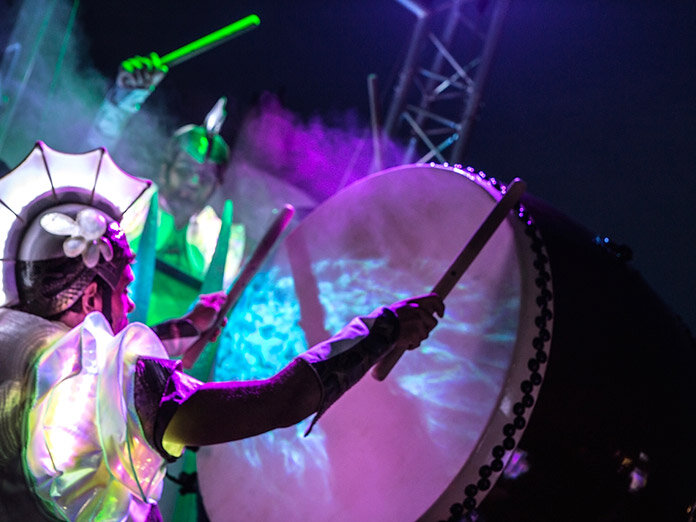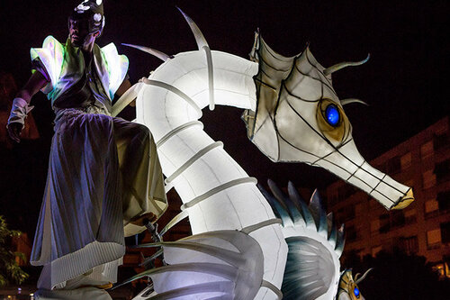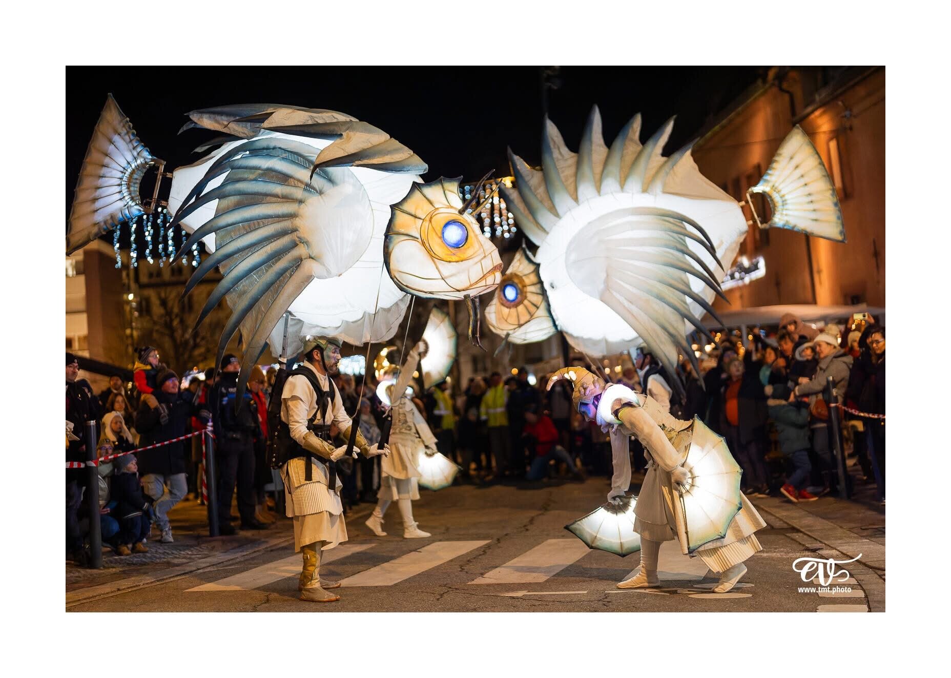 Un'impressionante processione di luci si muove nella notte, trasportata dai ritmi di Taikos e dai suoni elettronici. Una via lattea di meduse, stelle scintillanti e un maestoso cavalluccio marino, accompagnati da trampolieri, guidano con orgoglio il galleggiante Océanis.